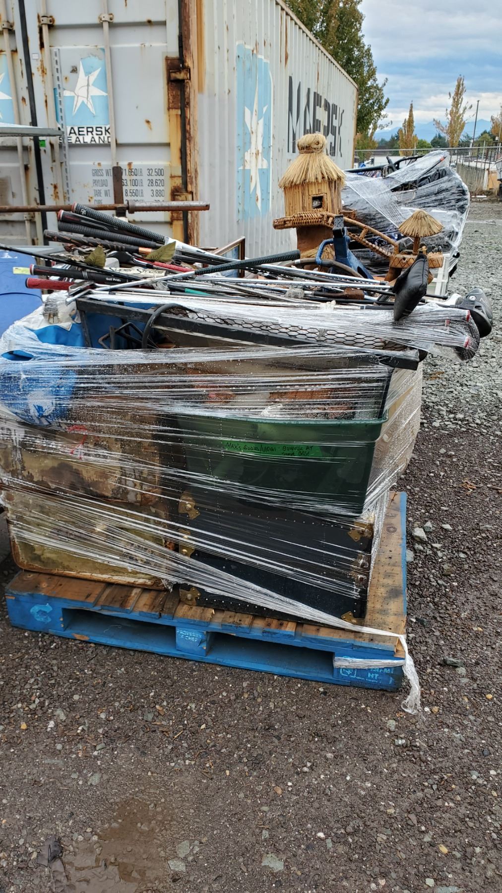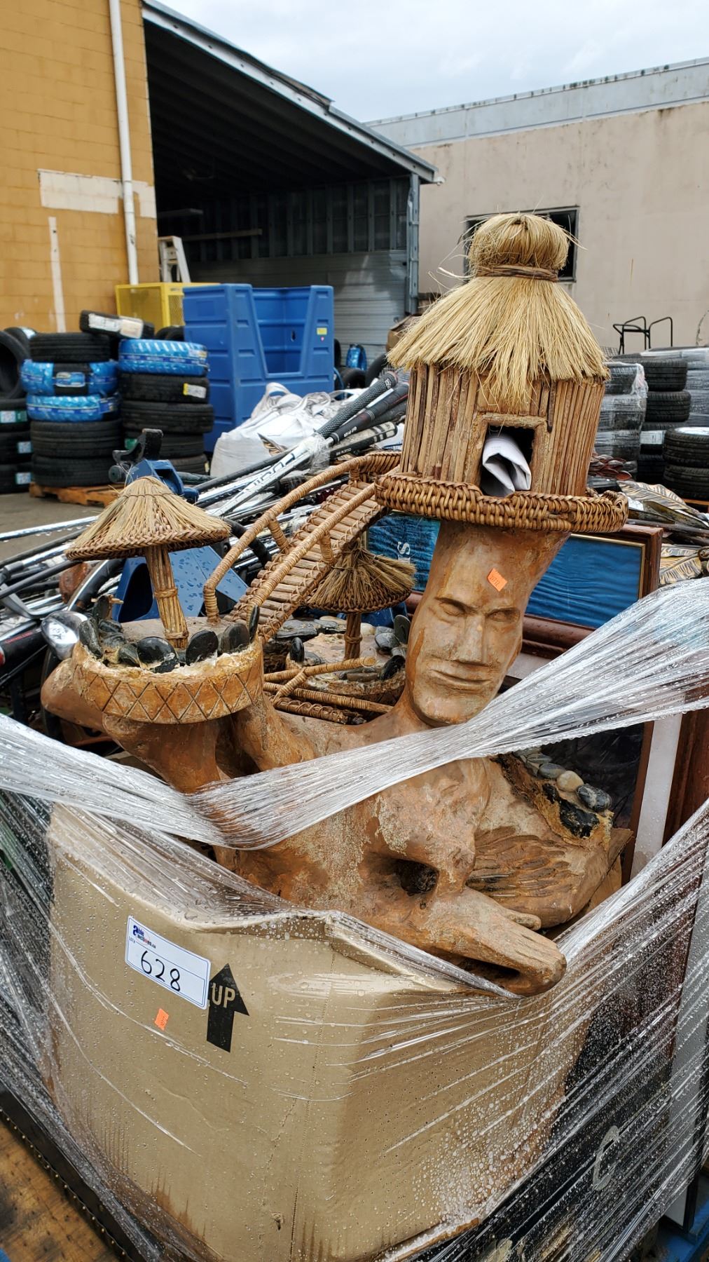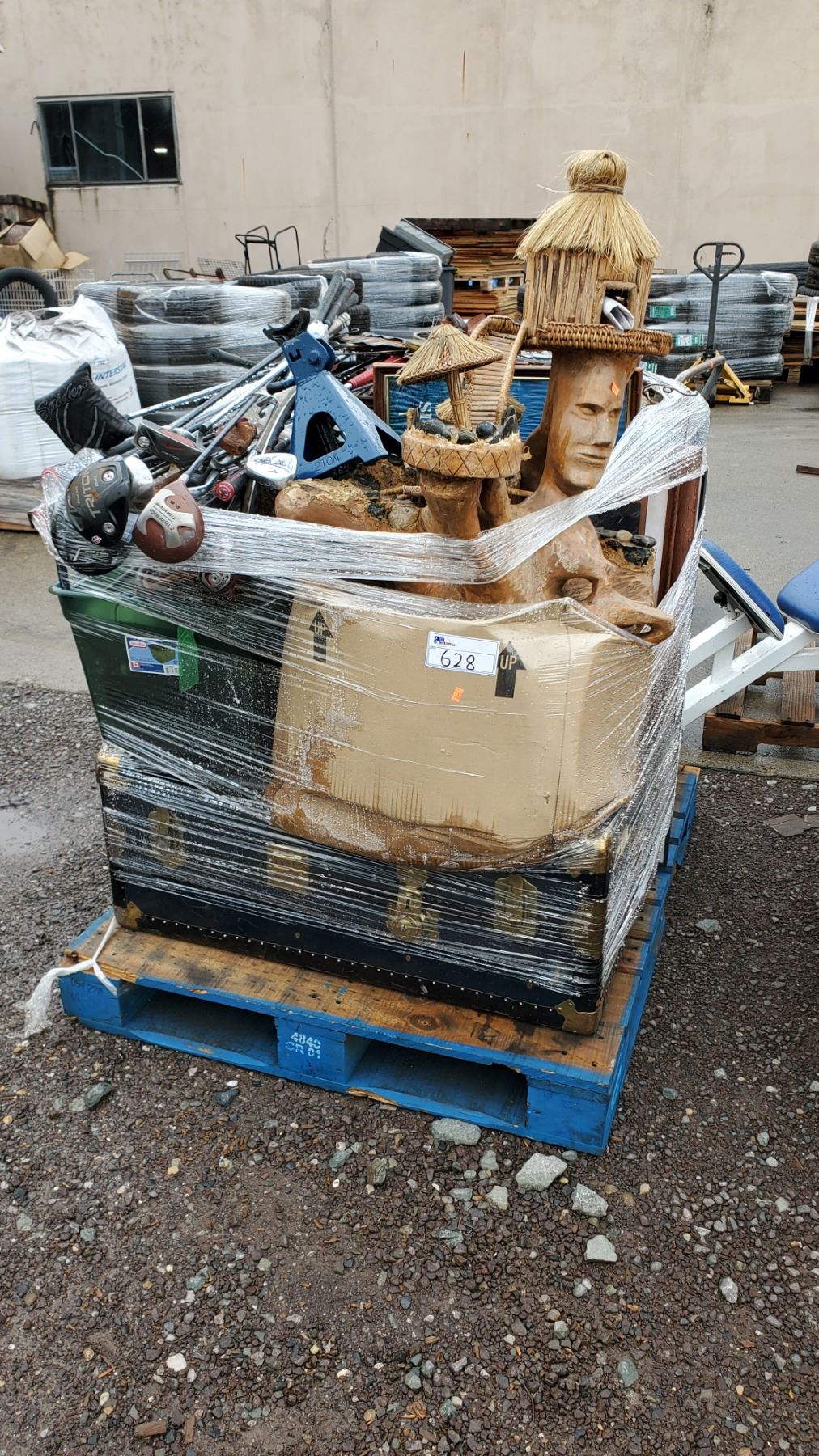 PALLET OF ASSORTED ITEMS INCLUDING; MINIATURE TIKI MANSION, GOLF CLUBS, FRAMED ART & MORE