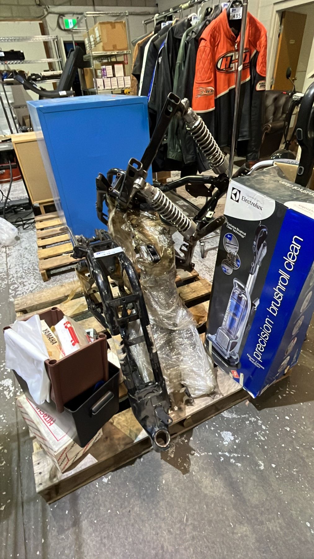 PALLET OF ASSORTED ITEMS INCLUDING; MOTORCYCLE PARTS, VACUUM, BIT ORGANIZERS WITH CONTENTS & MORE