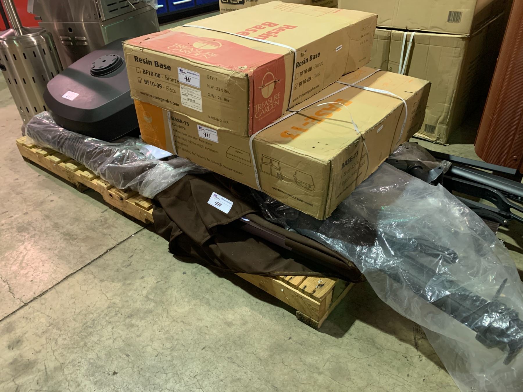 PALLET OF ASSORTED OUTDOOR PATIO UNBRELLA PARTS & BASES