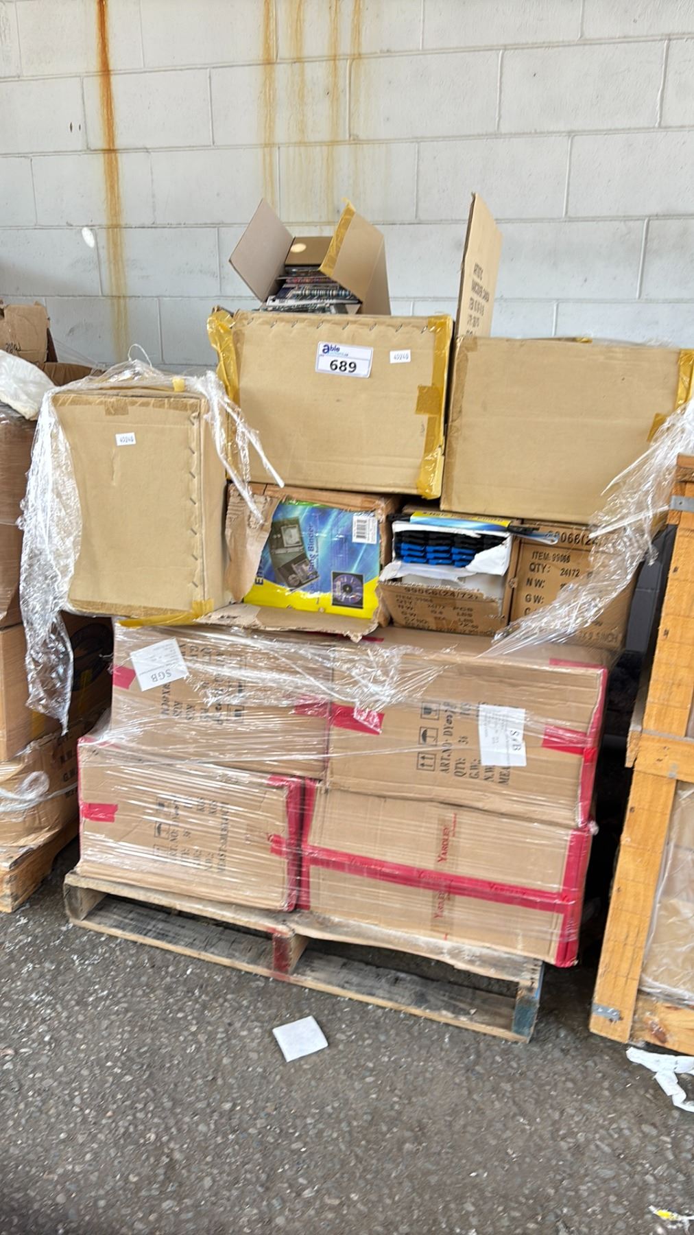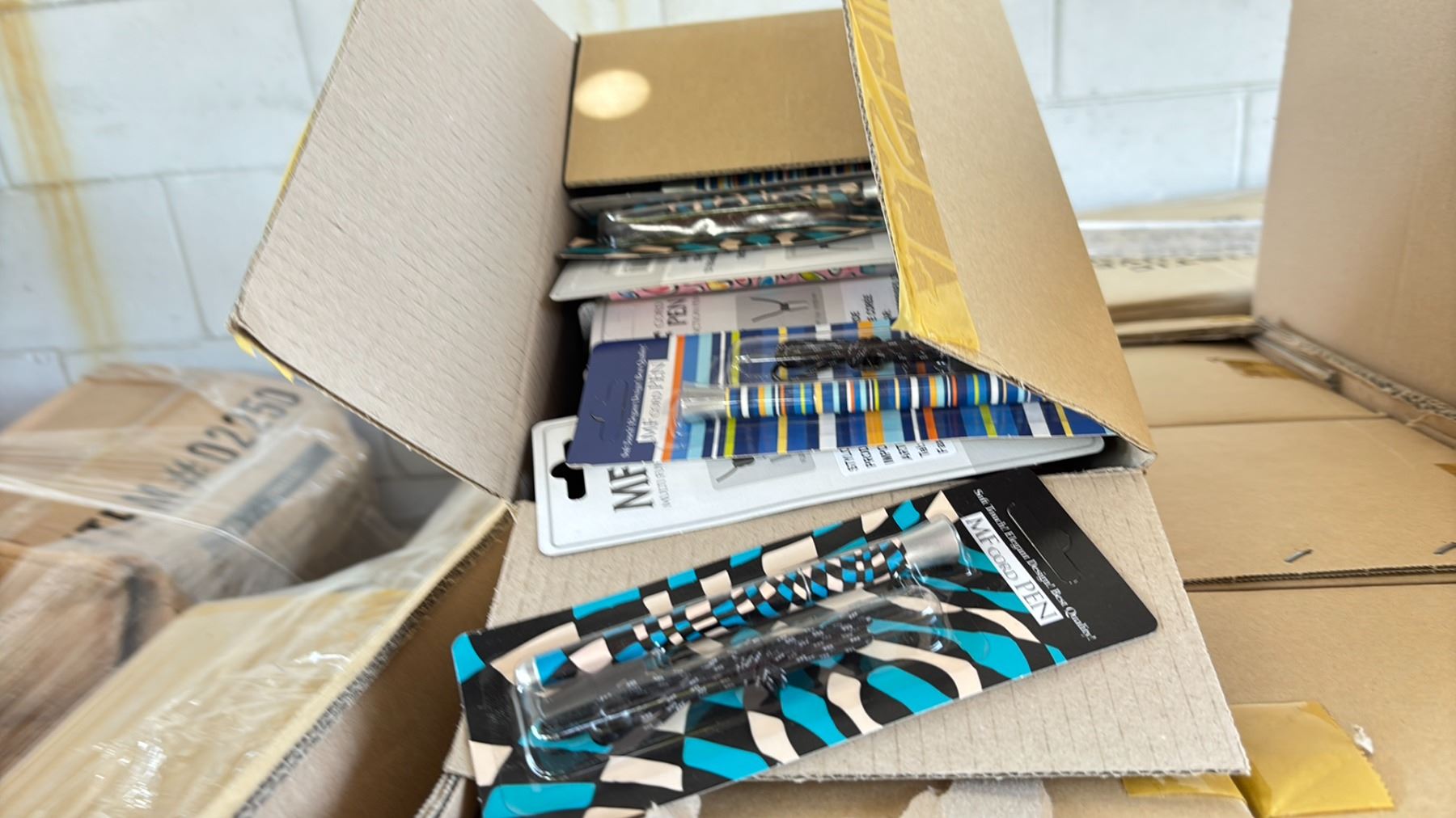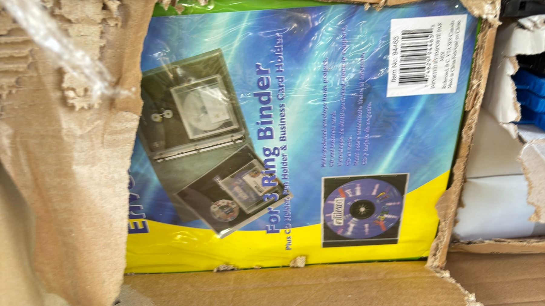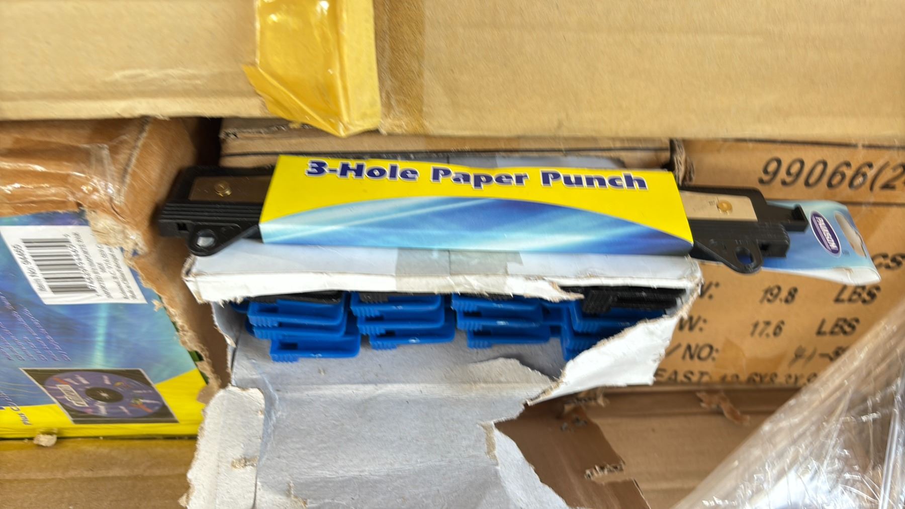 PALLET OF ASSORTED PENS, 3 HOLE PAPER PUNCHES, 3 RING BINDERS & MORE