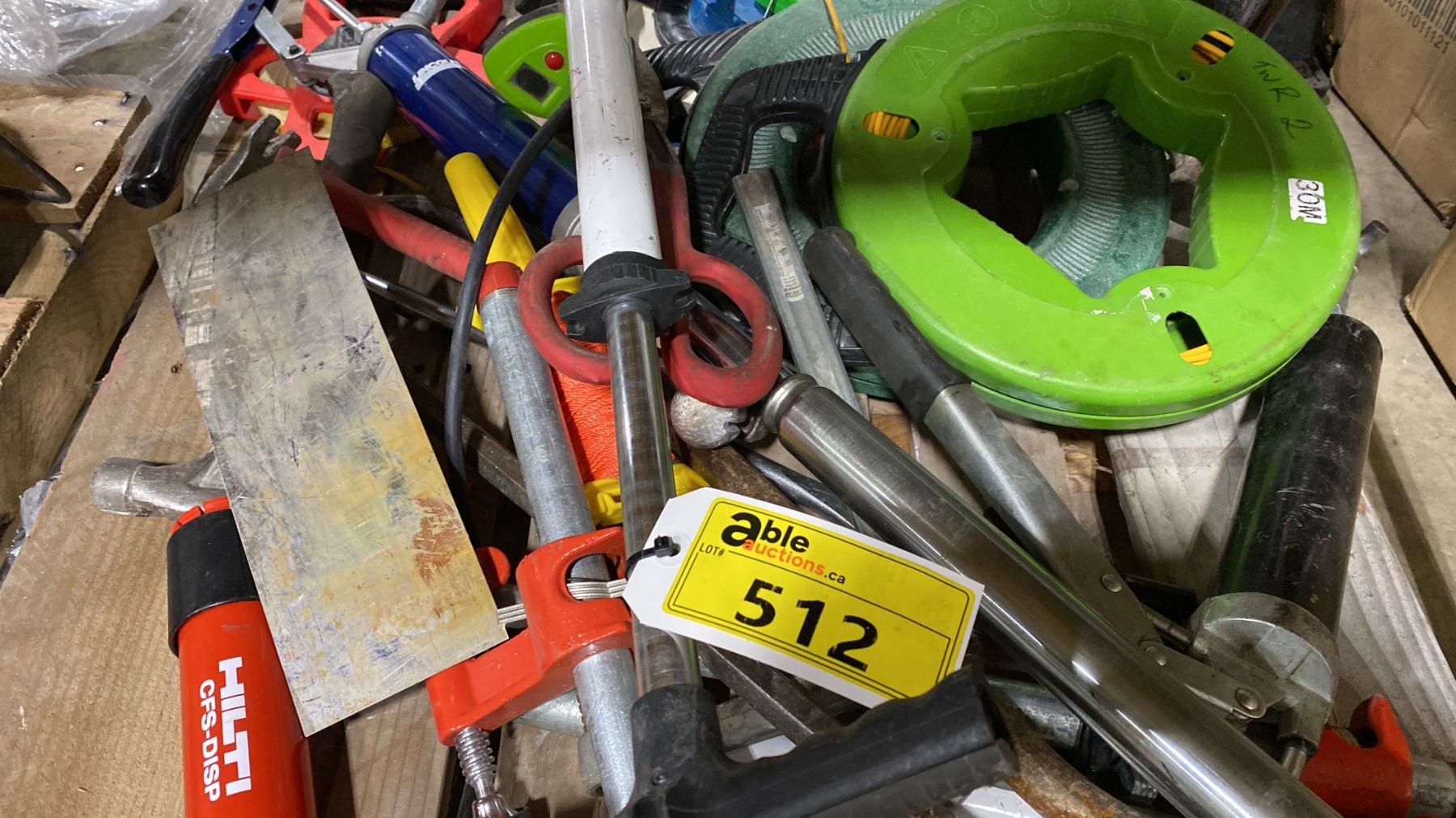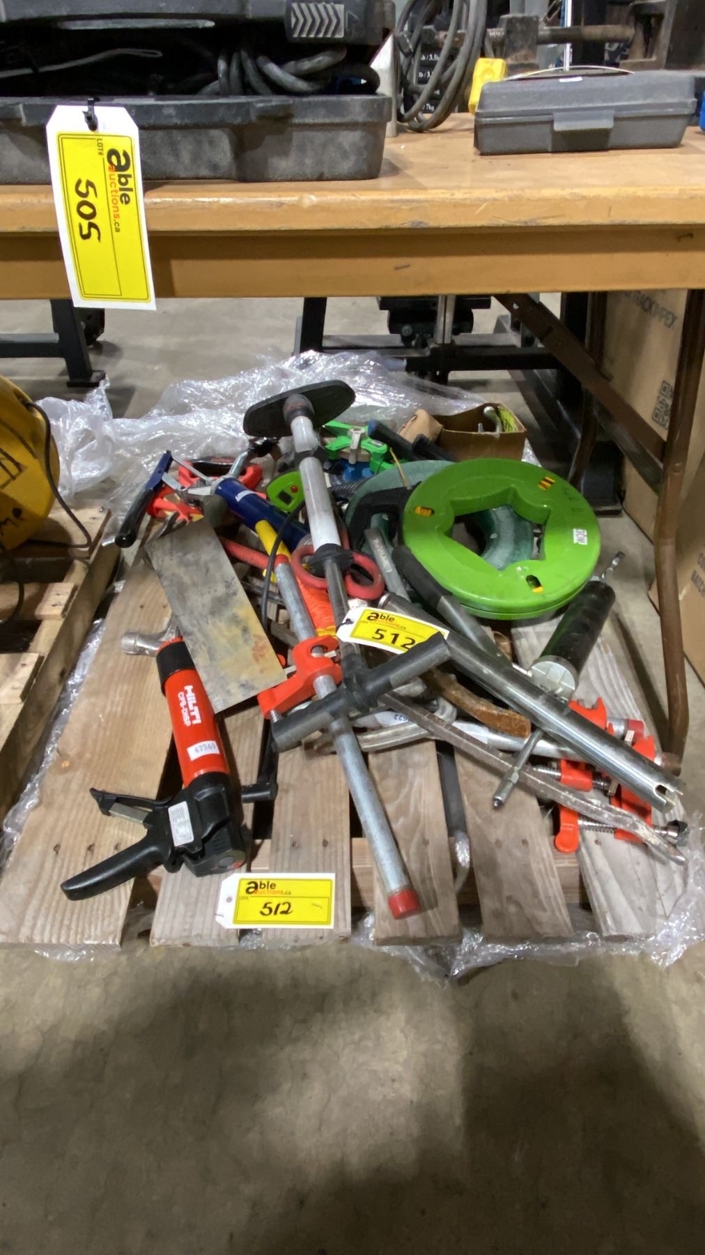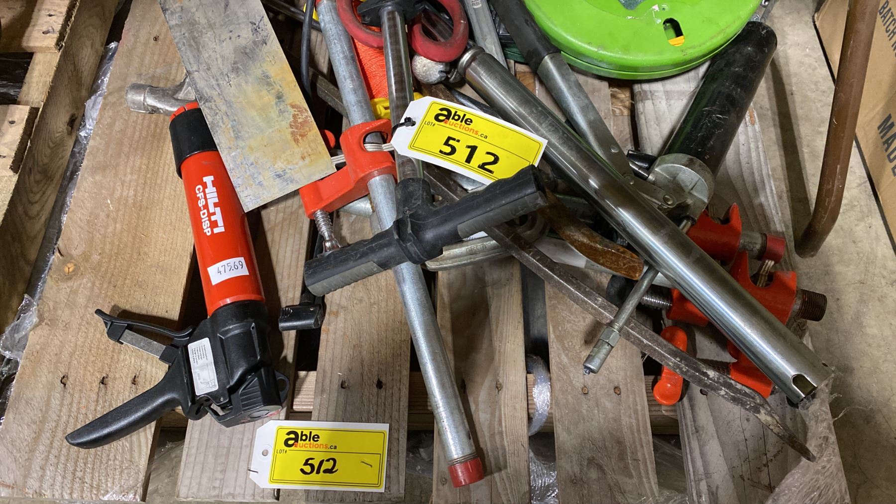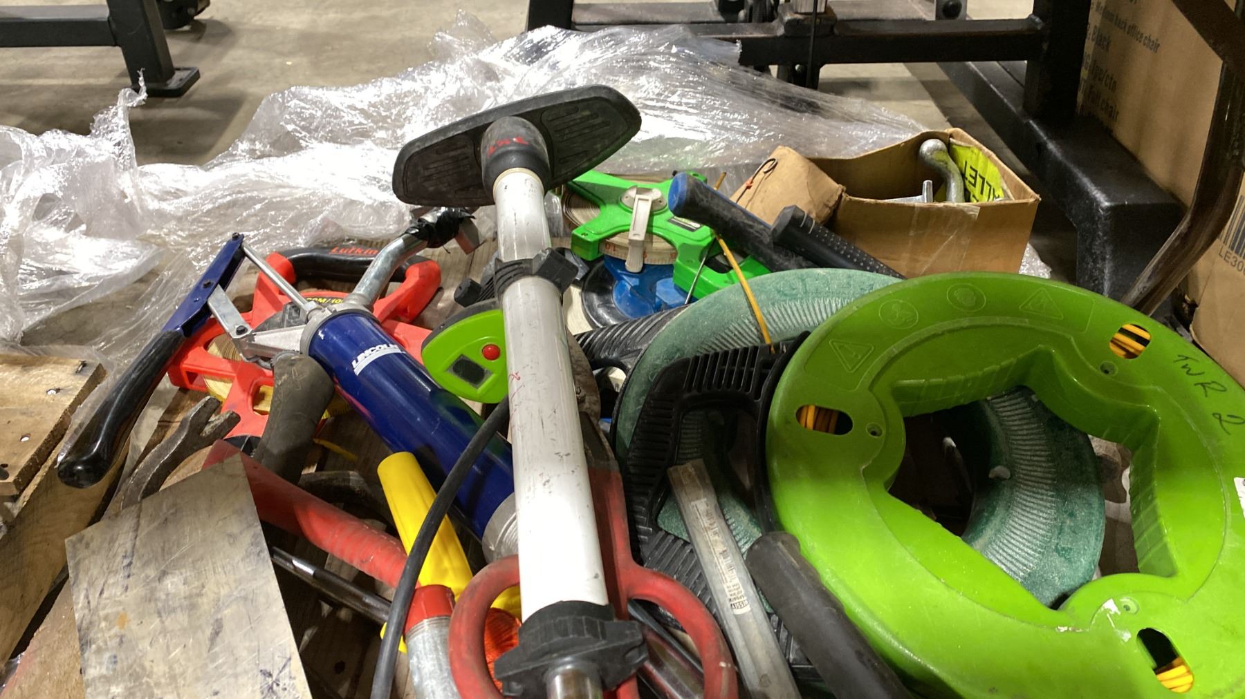 PALLET OF ASSORTED PIPE CLAMPS, HAND TOOLS, GREASE GUNS, & CABLE PULLERS *MUST TAKE ALL*