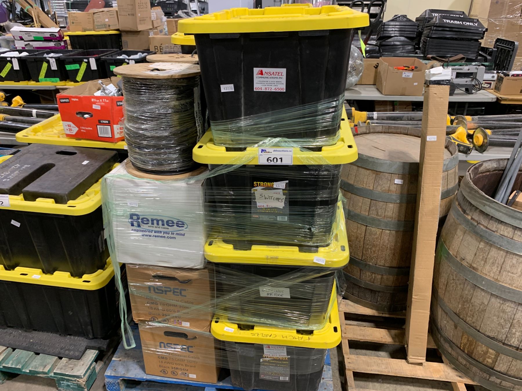 PALLET OF ASSORTED PLASTIC BINS OF ELECTRIC CABLES, SWITCHES, WIRELESS BRIDGES, OPEN MASH, PATCH