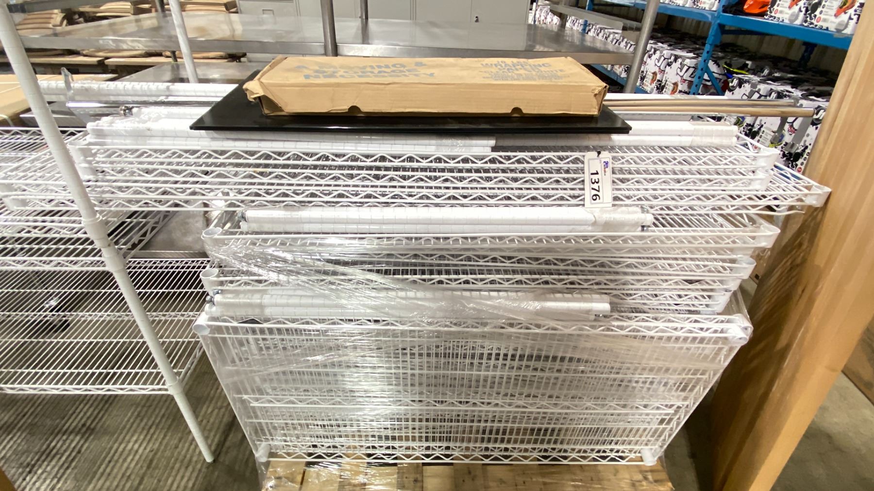 PALLET OF ASSORTED WHITE COMMERCIAL METRO RACKING SYSTEM PARTS, 2 HANGER BARS, PACKAGING PAPER, & 2