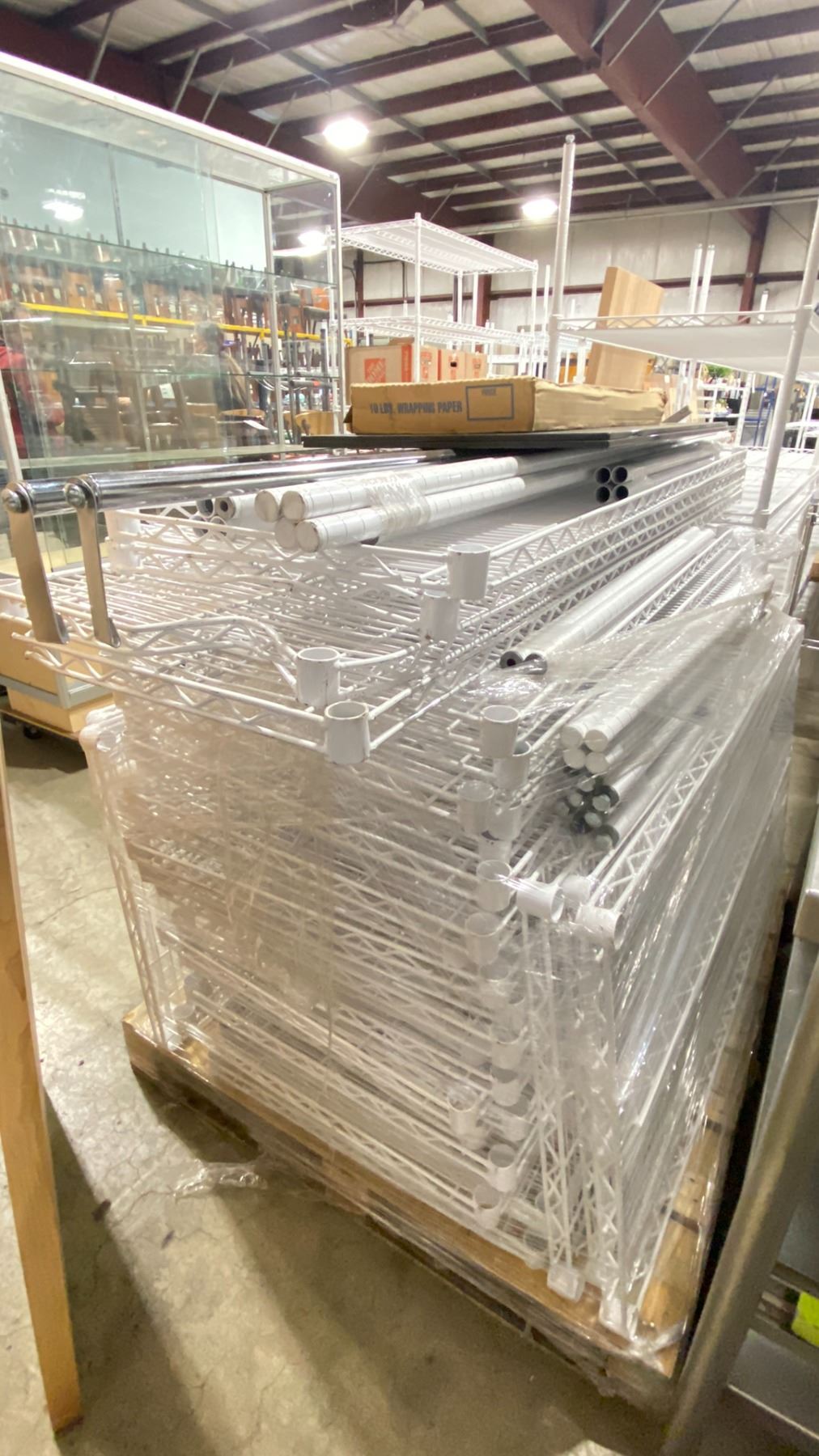 PALLET OF ASSORTED WHITE COMMERCIAL METRO RACKING SYSTEM PARTS, 2 HANGER BARS, PACKAGING PAPER, & 2 FROSTED GLASS SHELVES