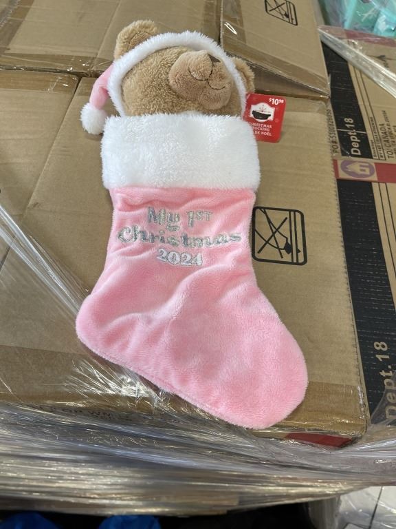 PALLET OF BABY STOCKINGS, PINK , FIRST CHRISTMAS 2024