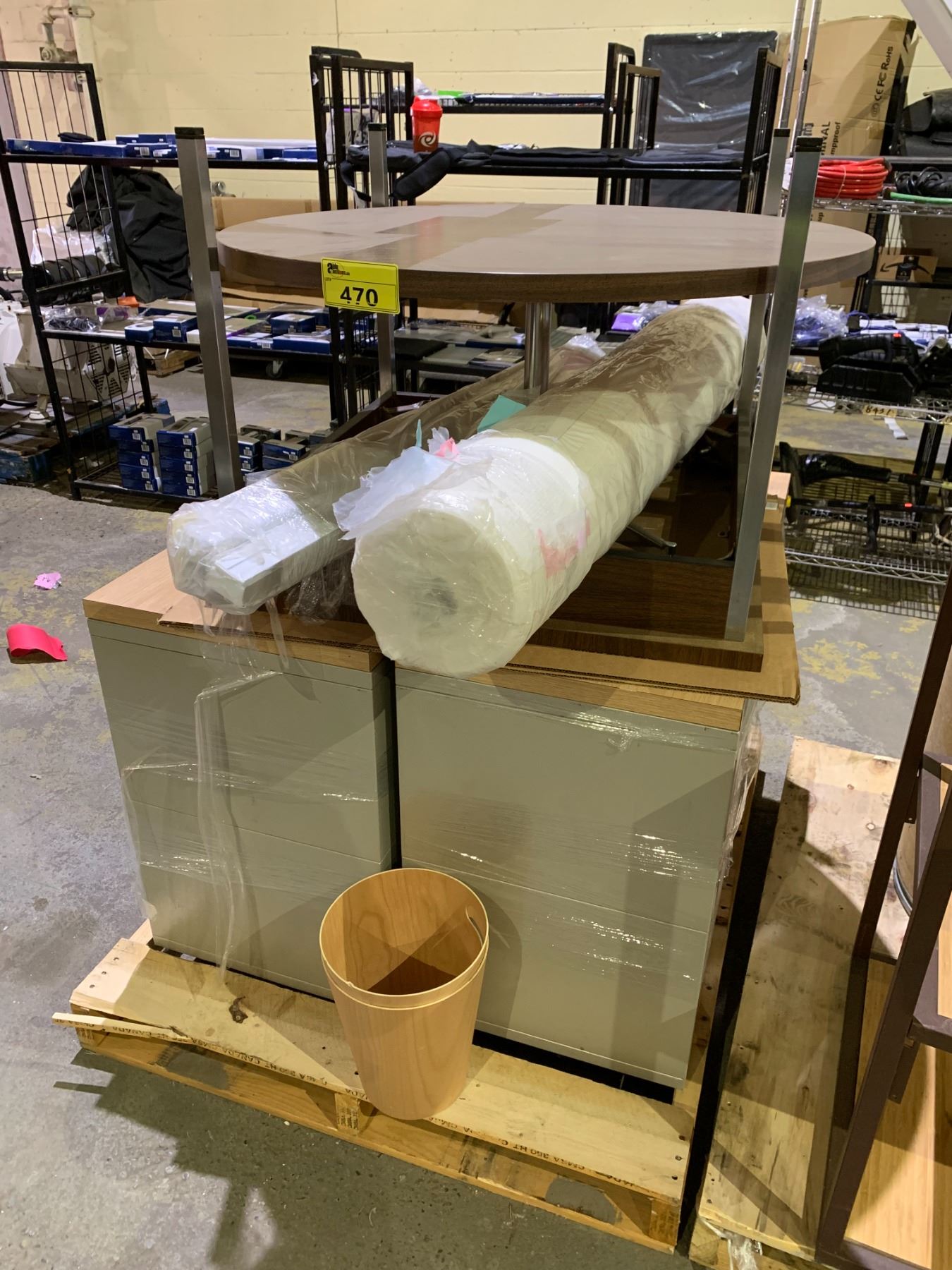 PALLET OF BLINDS, TABLES AND LATERAL FILE CABINETS