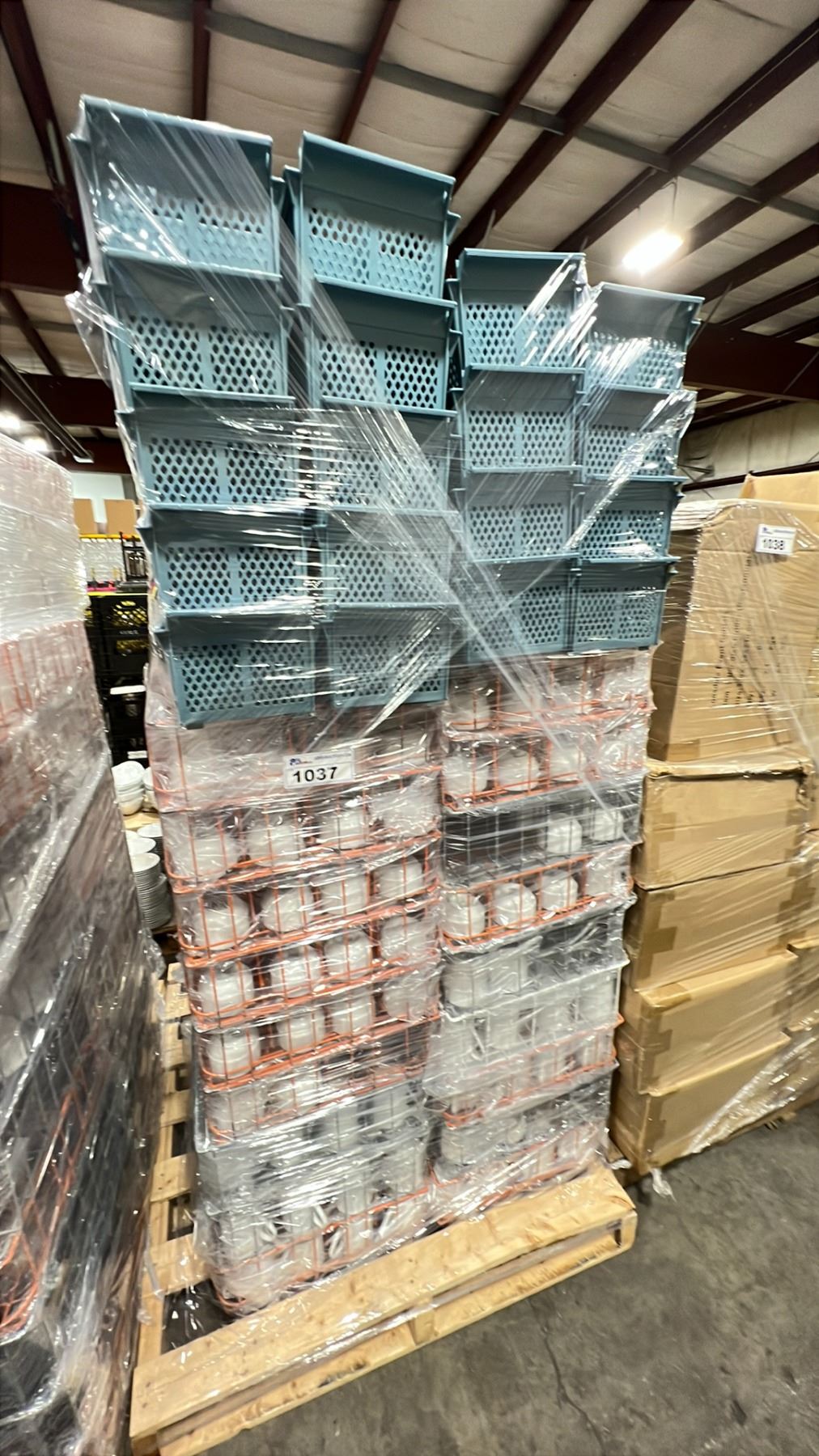 PALLET OF COMMERCIAL RESTAURANT TRAYS OF DESSERT BOWLS, WHITE COFFEE MUGS & DISHWASHER CUTLERY RACKS ( APPROX. 720 PCS )