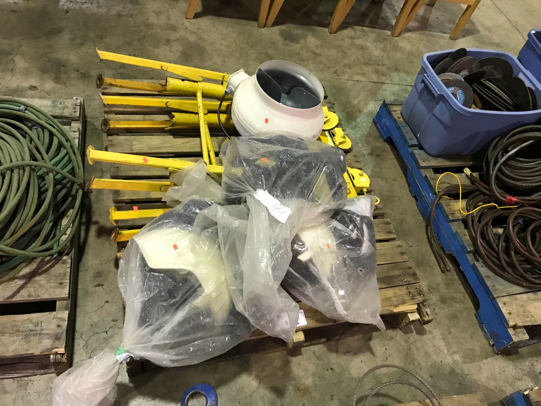 PALLET OF DUAL ROLLER STANDS, SAFETY HELMETS & ELECTRIC VENTILATION FAN