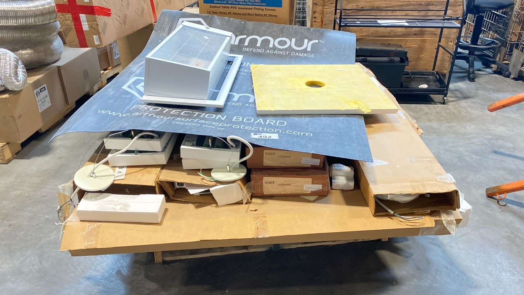 PALLET OF HARDWIRE FLUORESCENT CEILING TUBE LIGHTING WITH HARDWARE & CORDS, MOUNTABLE FIRE EXTINGUISHER CASE- NO KEY, BUILDING TRIM AND MORE