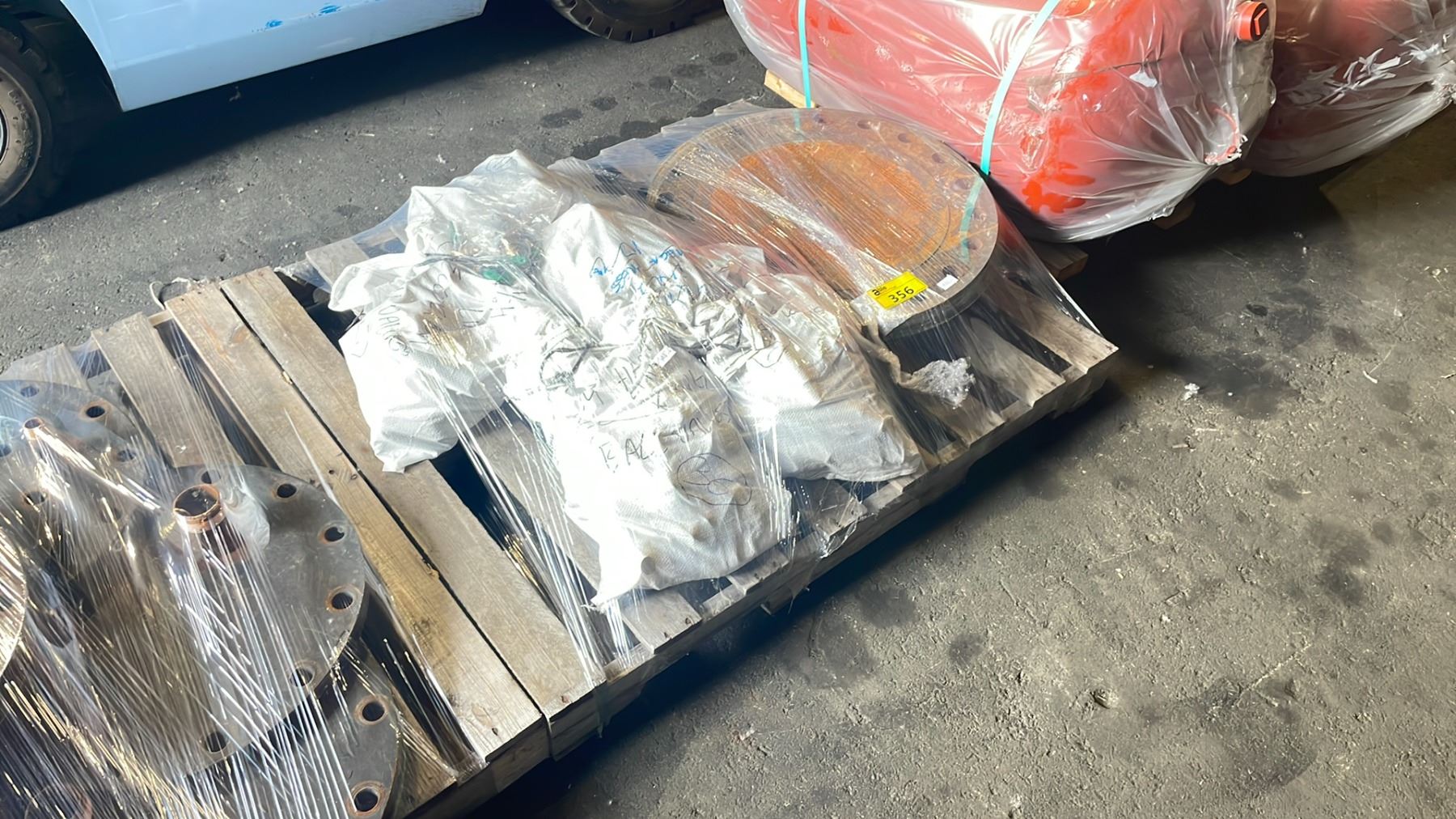 PALLET OF HEAVY DUTY ASSORTED SIZED INDUSTRIAL PLUMBING CAP PLATES & BAGS OF VALVES
