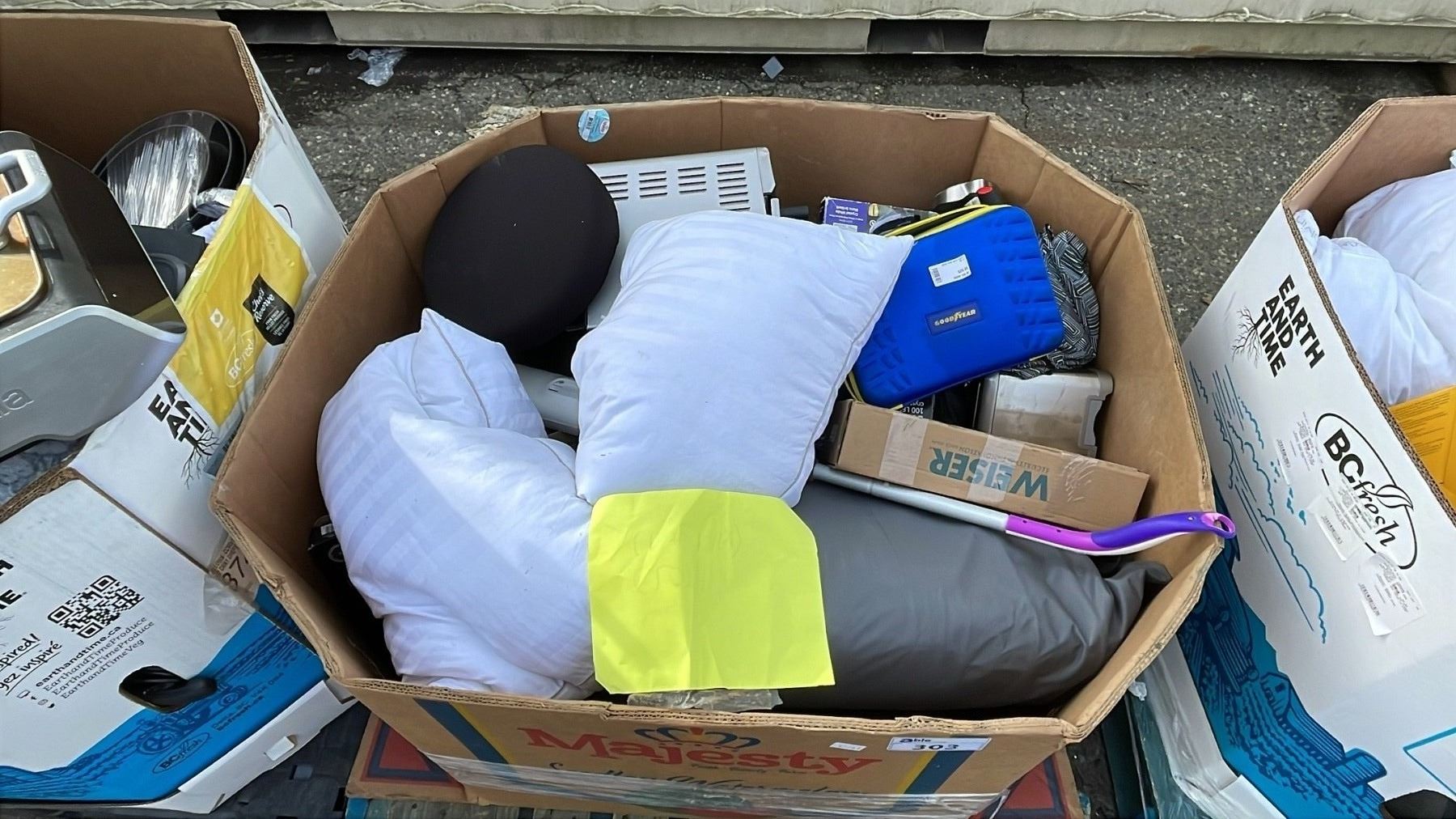 PALLET OF HOME GOODS - PILLOWS, SMALL APPLIANCES, AIR MATTRESS, UMBRELLA, LED CELLING LIGHT, STOOL & MORE *MUST TAKE ALL ON PALLET*