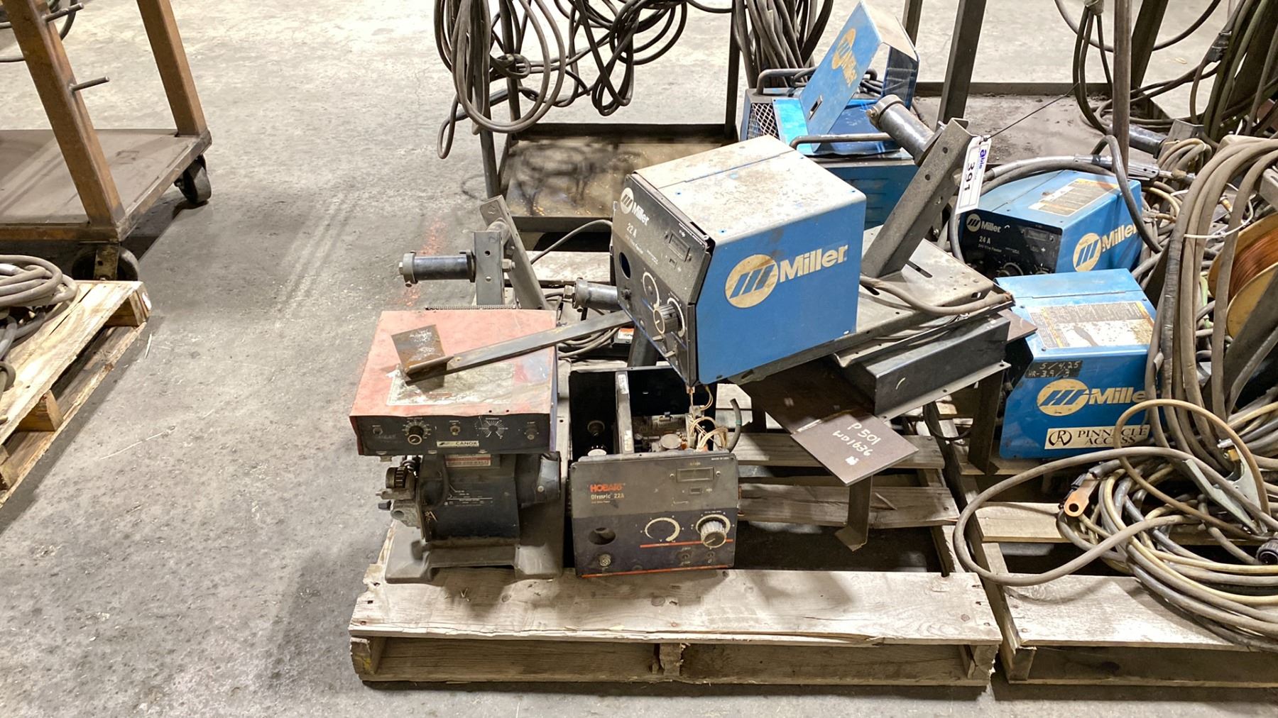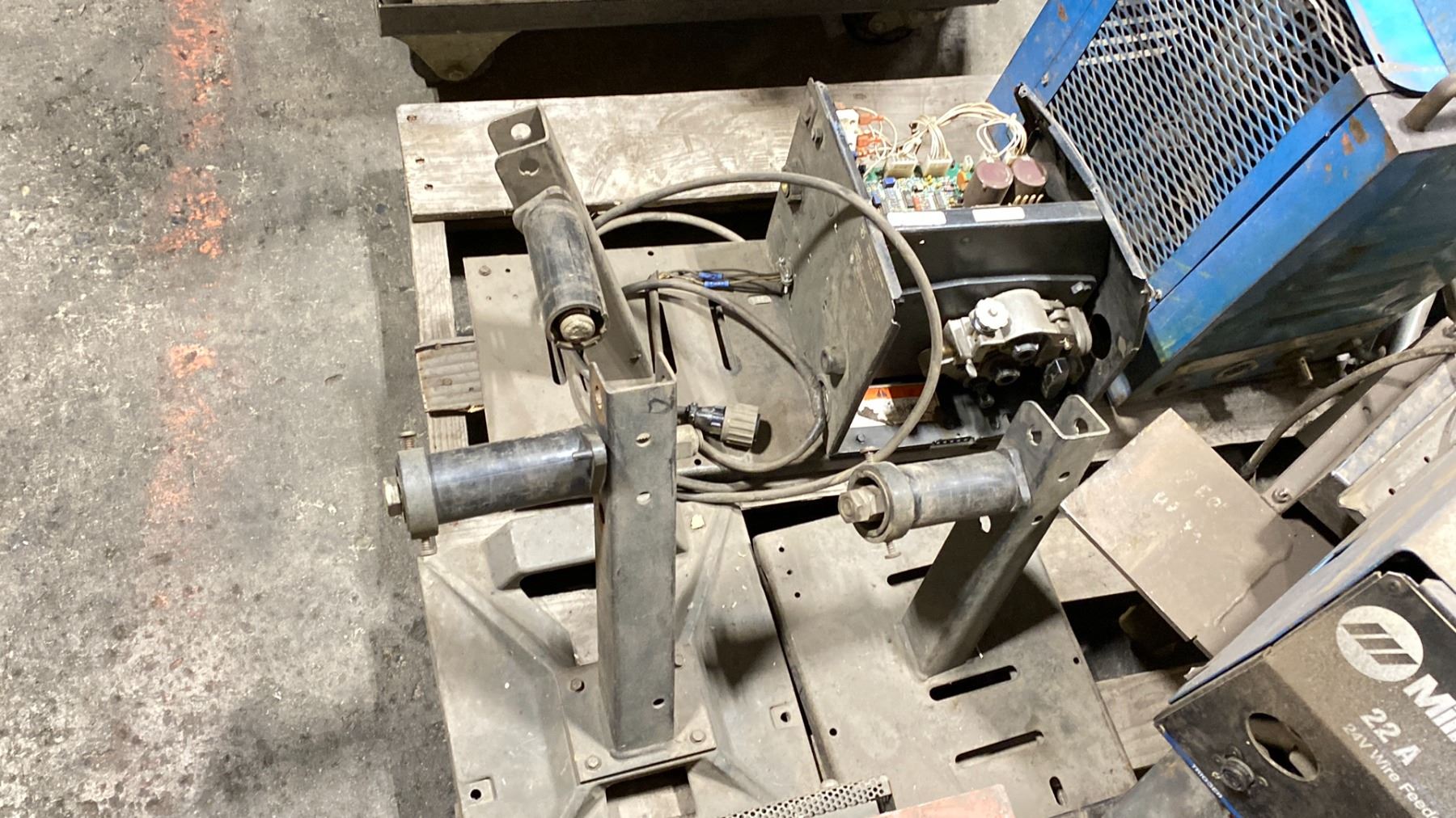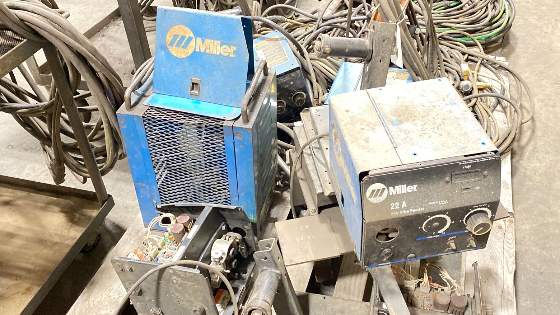 PALLET OF INDUSTRIAL MIG WIRE FEEDERS - INCLUDES MILLER 22A WIRE FEEDER, HOBART OLYMPIC 22A UNIT CANOX FEEDER TLF 150, ASSORTED WIRING, METAL BASE STAND AND MORE.. *INTERNAL BOARDS EXPOSED FOR PARTS OR REPAIR / NO WELDING TORCH OR CABLES*