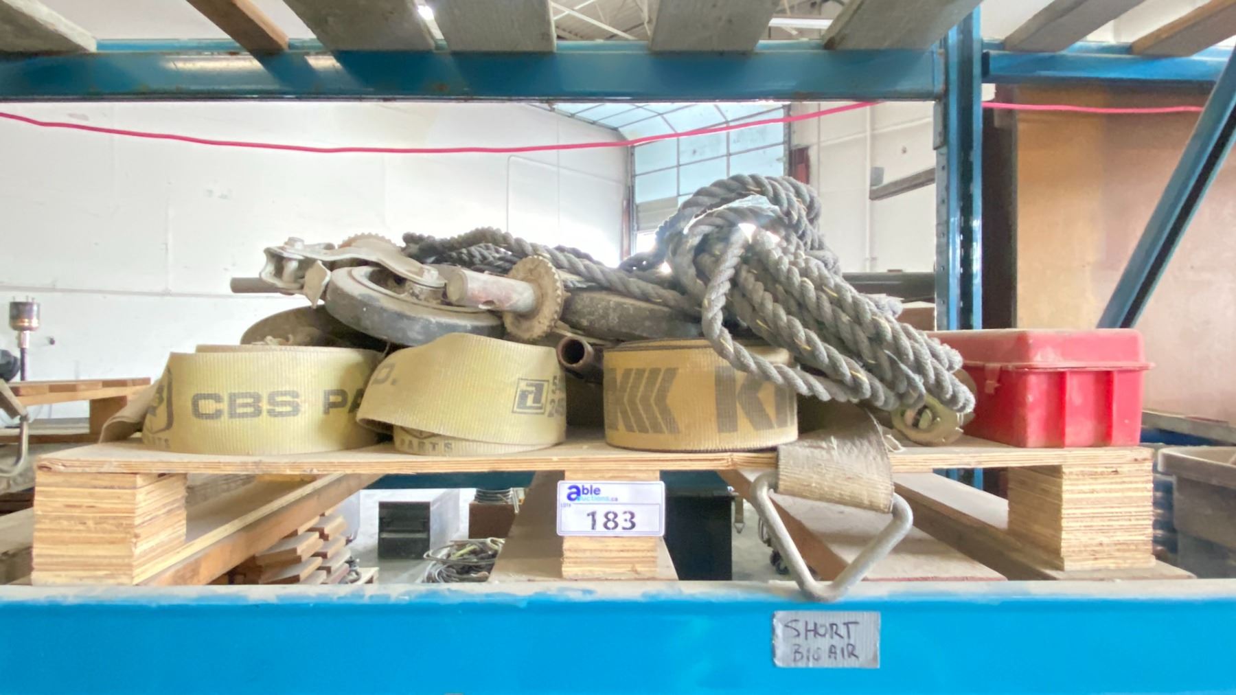 PALLET OF INDUSTRIAL RATCHET TIE-DOWNS/SAFETY LINE ROPE AND SCAFFOLDING WHEELS