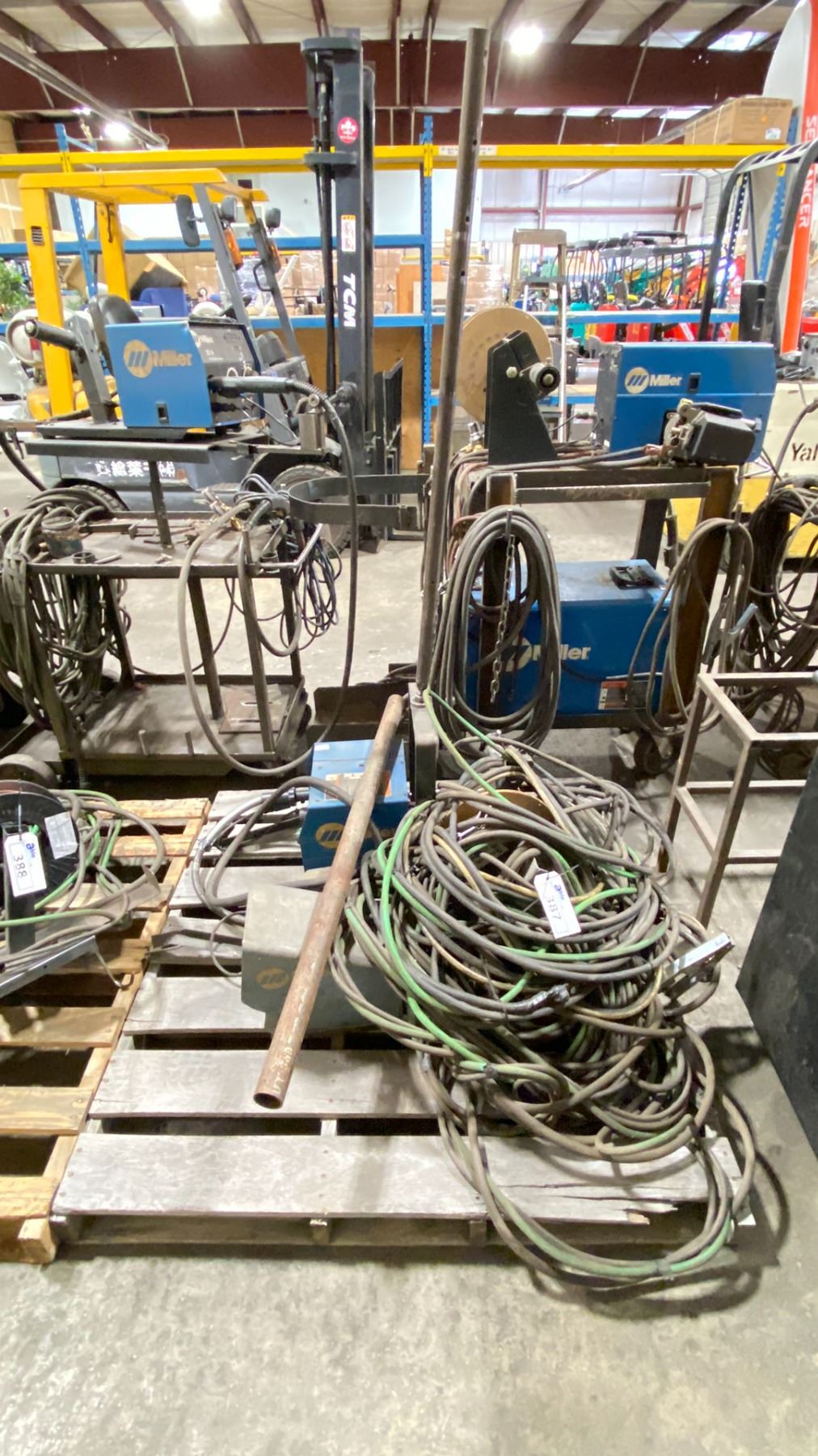 PALLET OF MILLER 24A WIRE FEEDERS (X2) WITH WELDING LEADS GROUND CABLES, SPOOL AND MORE..