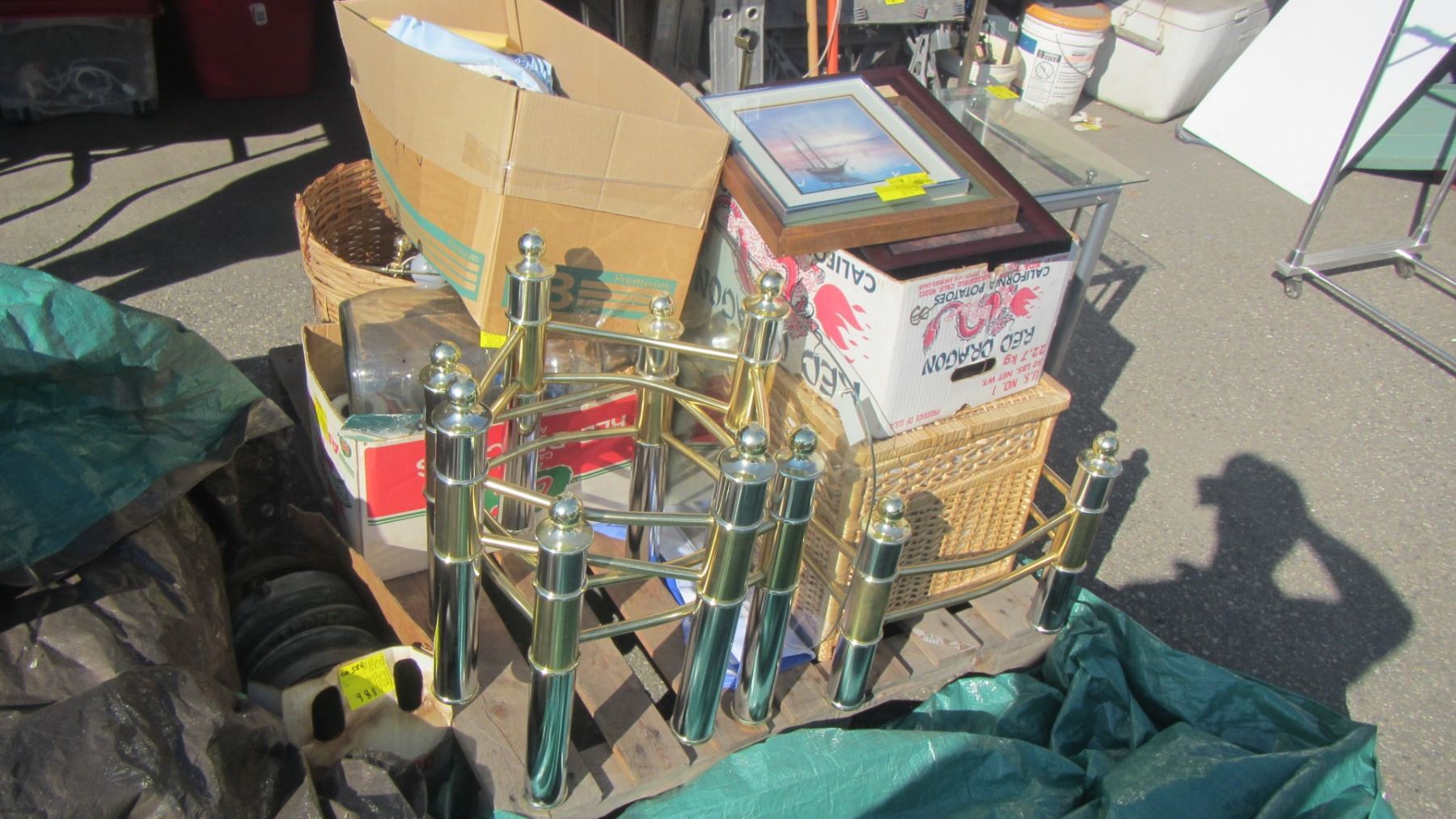 PALLET OF MISC. BRASS & GLASS TABLES, PICTURES, BASKETS, MATERIAL, ETC.