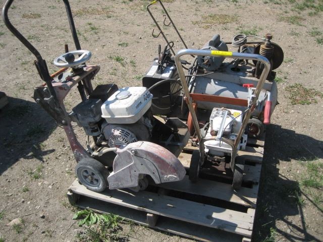 PALLET OF MISC CEMENT CUTTER, LAWN EDGER, WELDER & COMPRESSOR