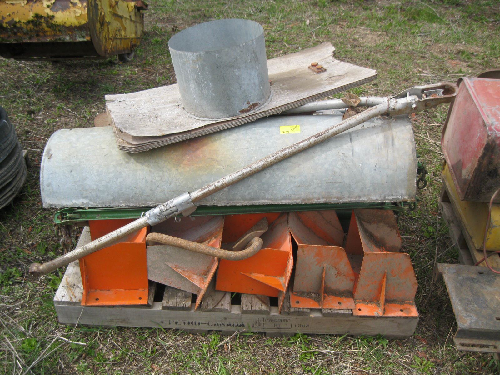 PALLET OF MISC: NECK SQUEEZES, OUTBOARD MOTOR, IMPLEMENT PARTS, ETC.