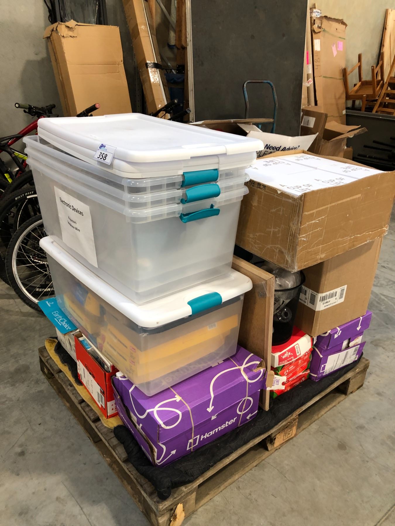 PALLET OF OFFICE SUPPLIES INCLUDING 4 CLEAR CONTAINERS, PRINTING PAPER, 33' HDMI CABLE BOX OF LED SPOTLIGHT PART NO. SP3021, CORKBOARD AND MORE - MUT TALL ALL INCLUDING PALLET