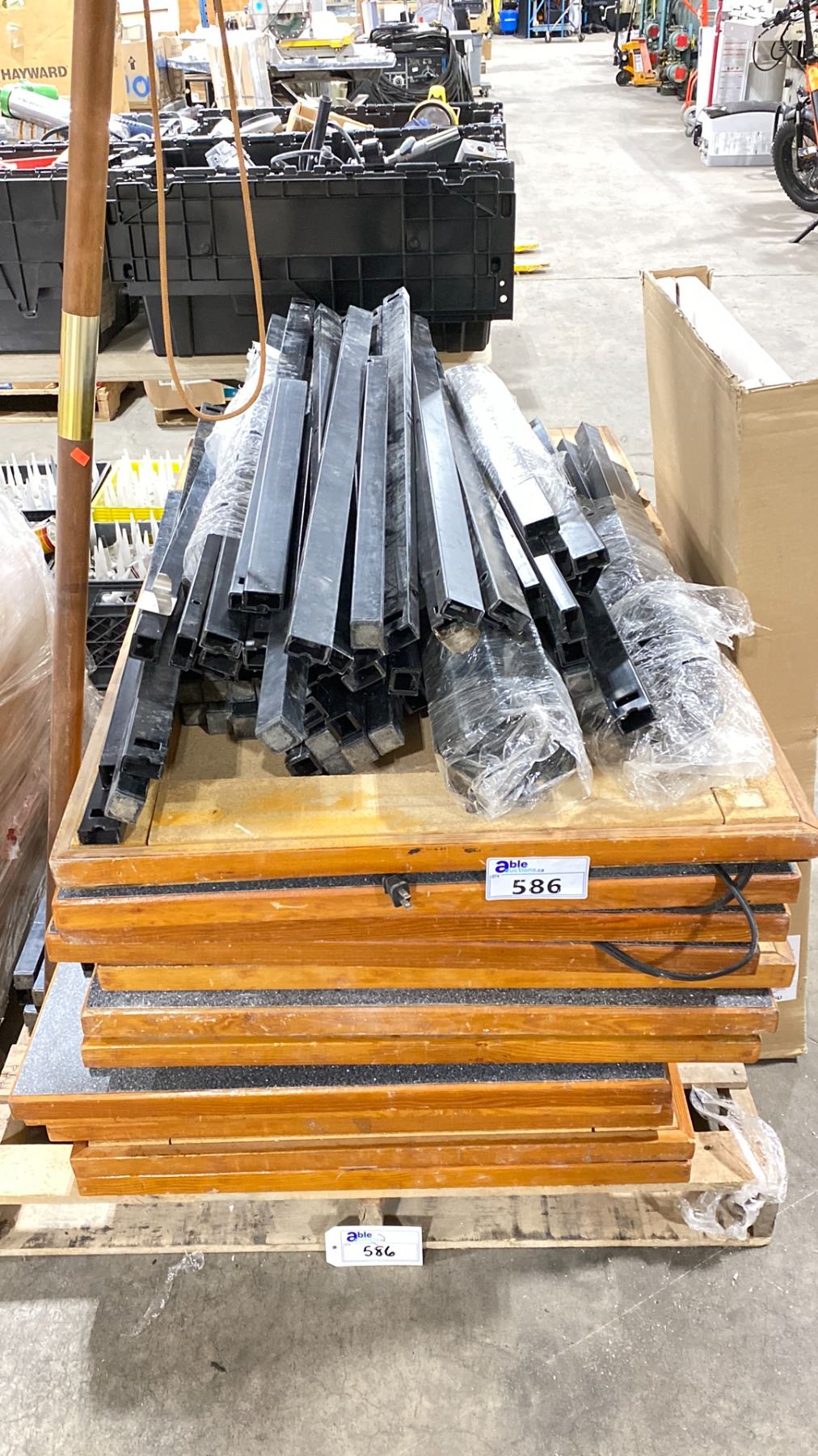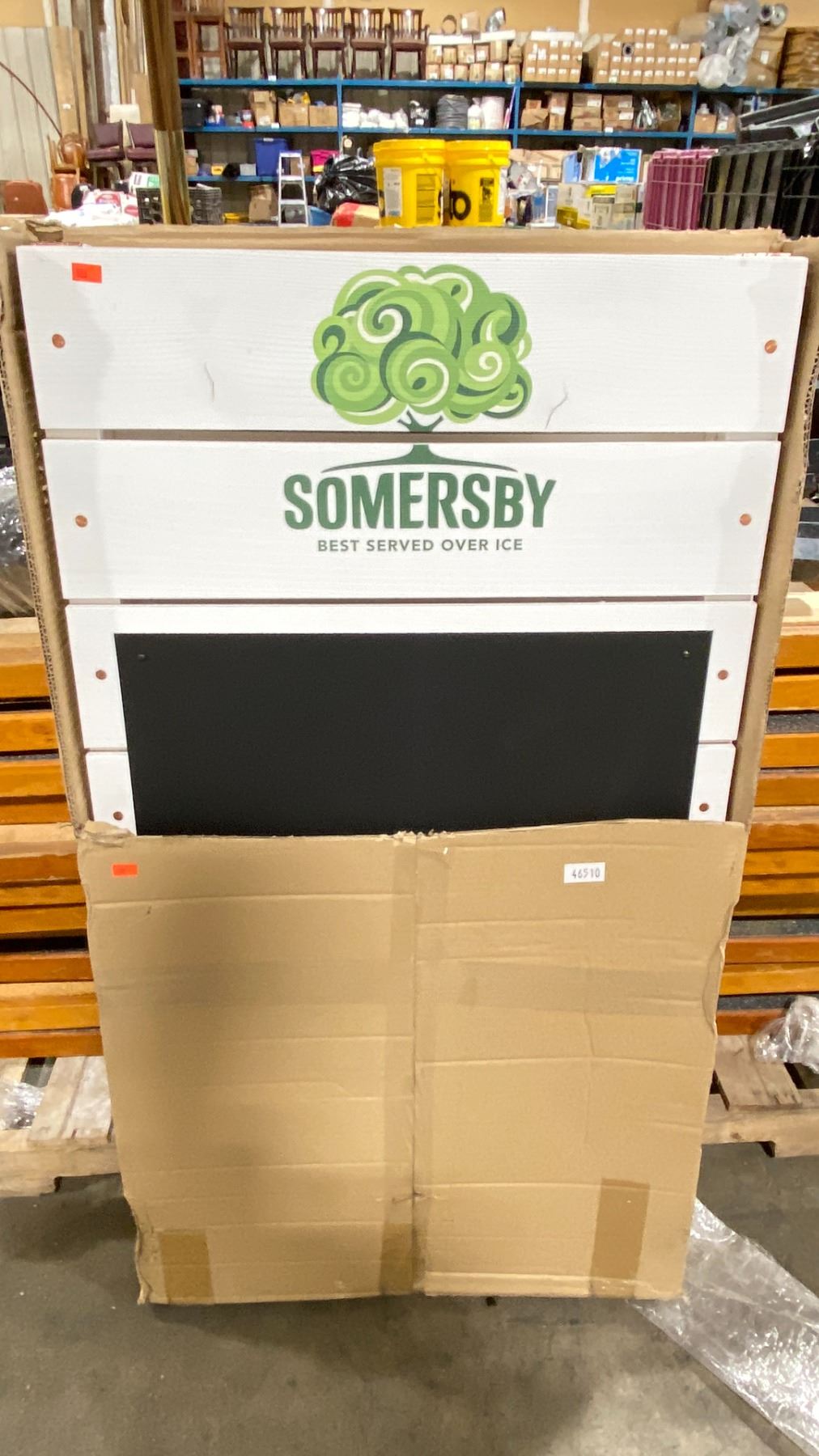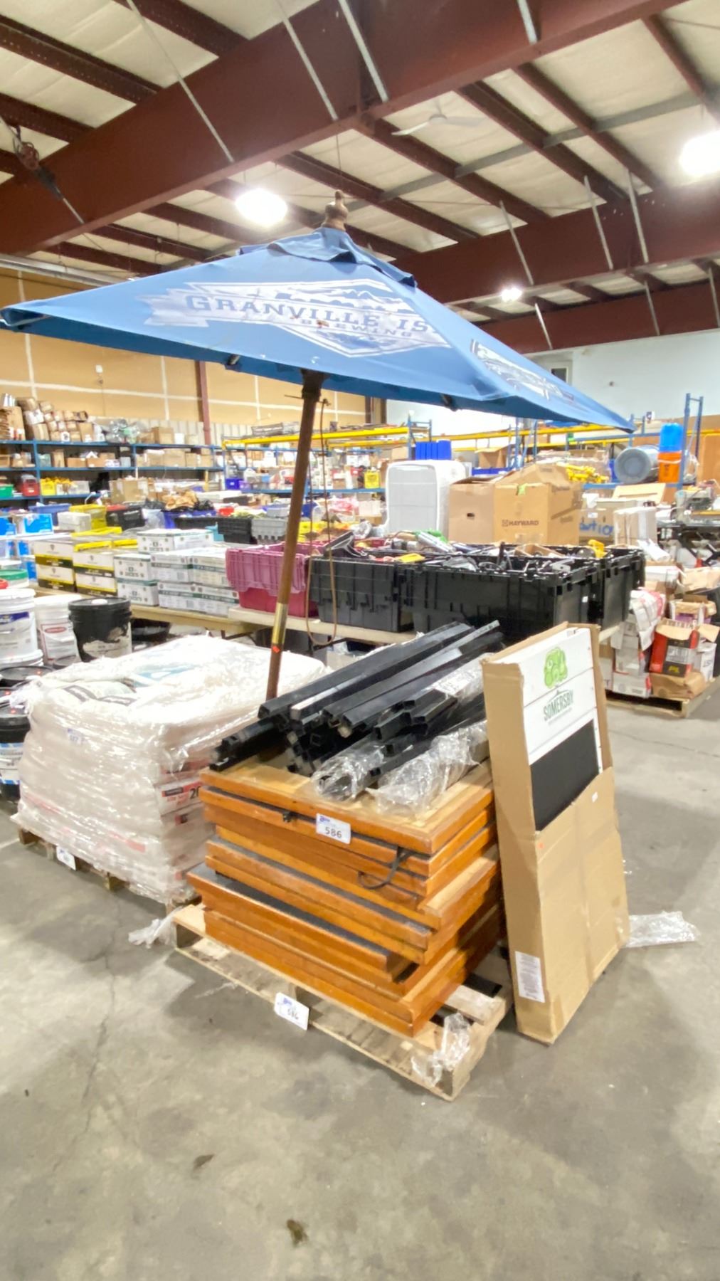 PALLET OF OPEN CENTER COMMERCIAL TABLE TOPS 46.5" X 29.5", COMMERCIAL MOLSON UMBRELLA, SOMERSBY SANDWICH BOARD SIGN & BLACK METAL SHELVING UNIT *MAY BE MISSING PARTS*
