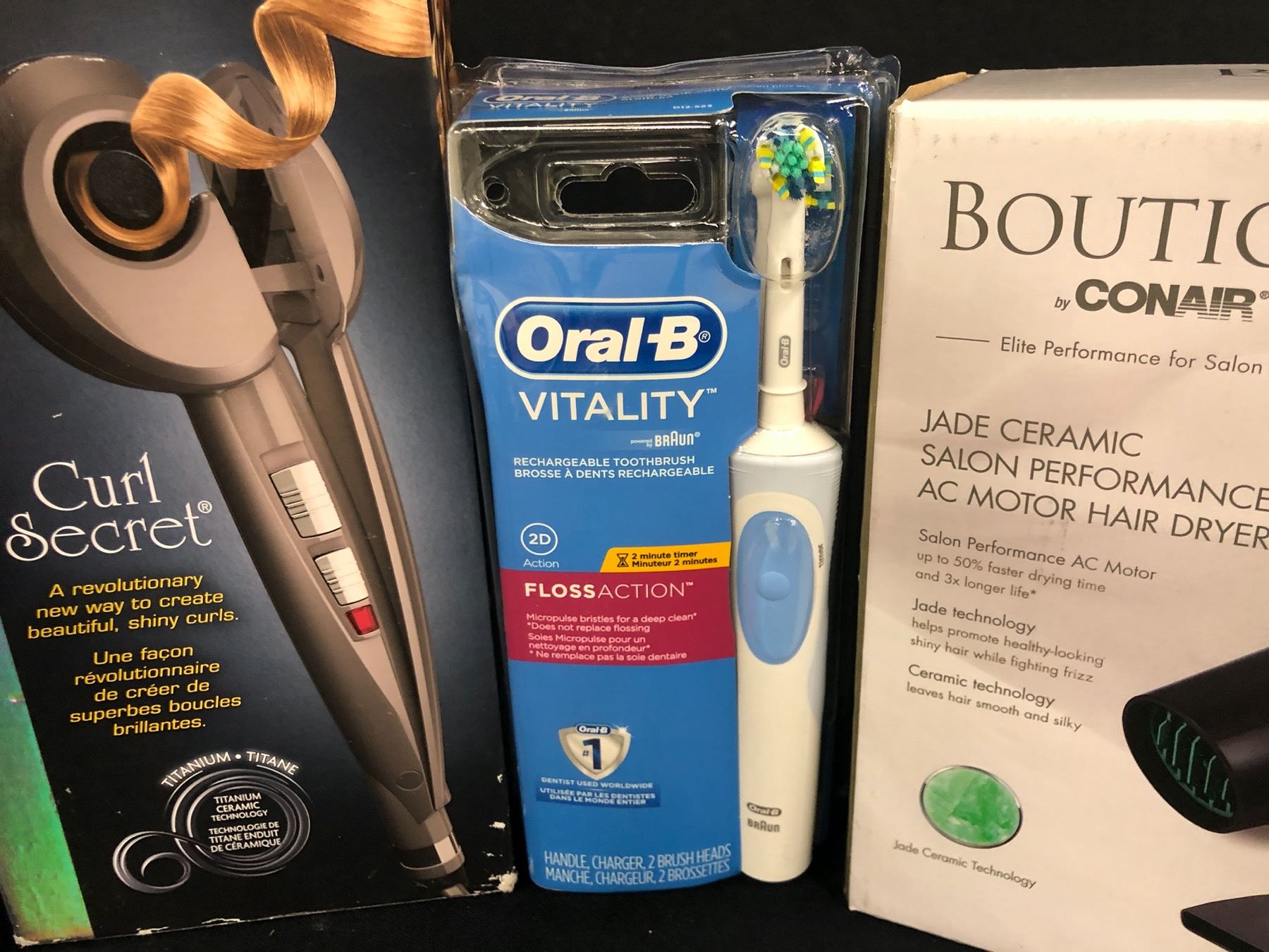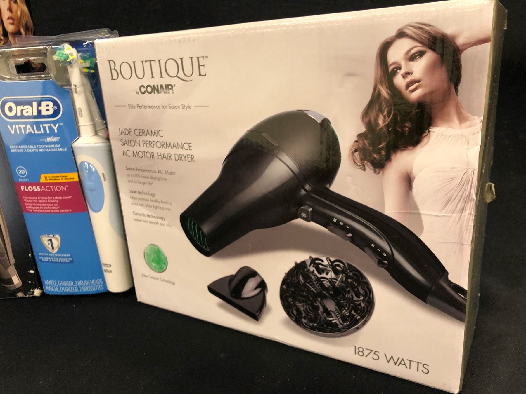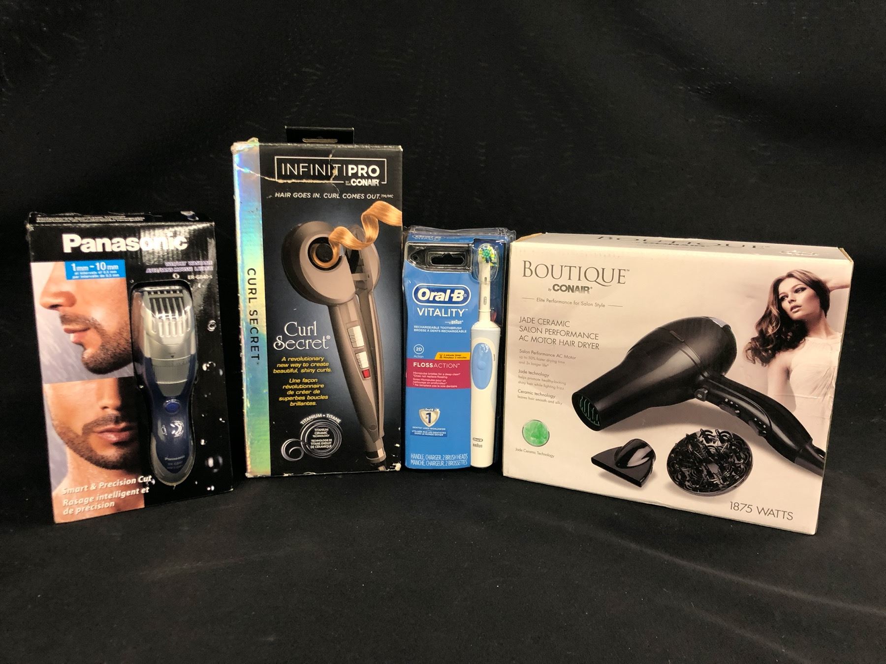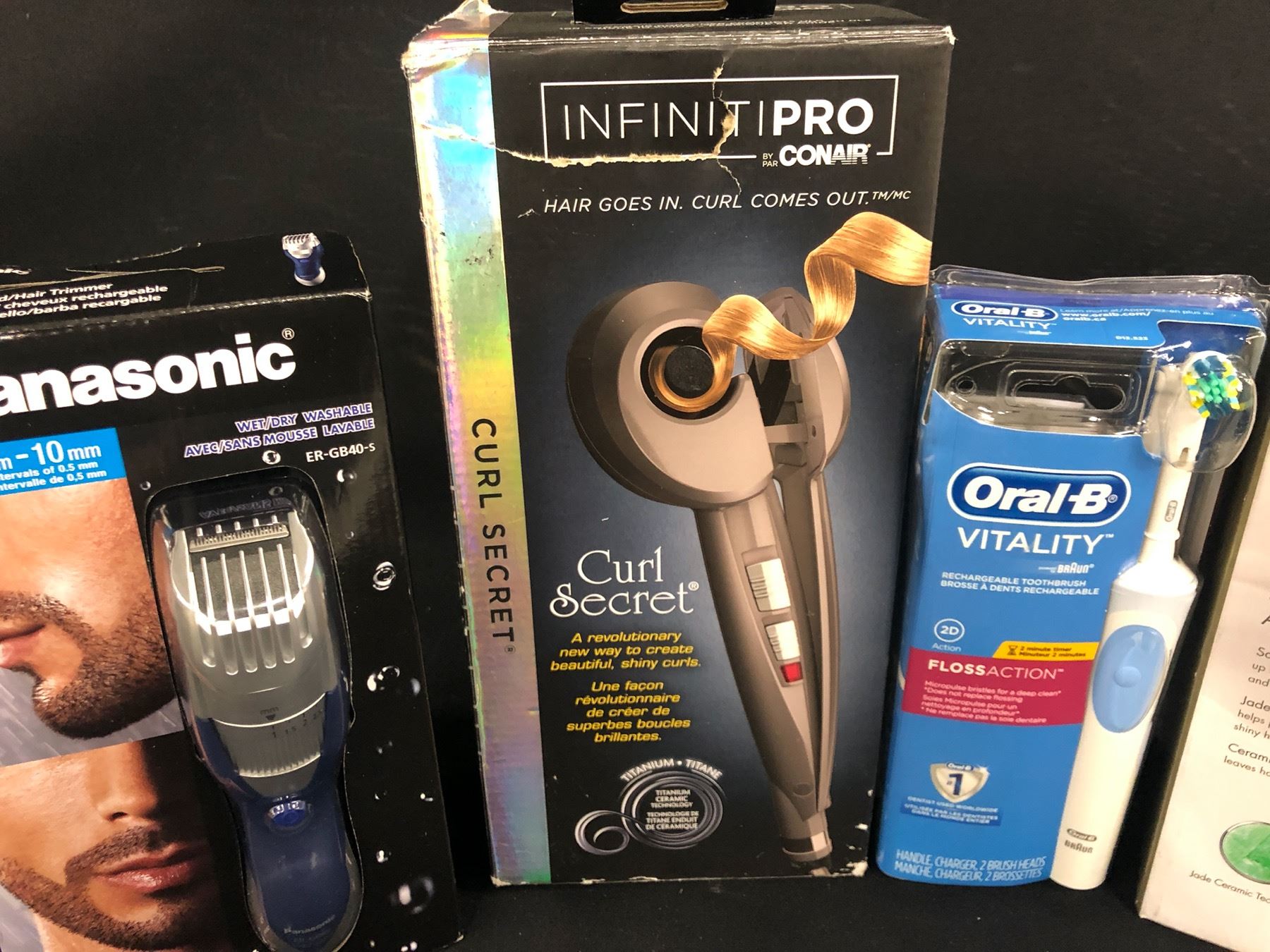 PANASONIC BEARD TRIMMER, INFINITI PRO HAIR CURLER, ORAL B ELECTRIC TOOTHBRUSH BOUTIQUE JADE CERAMIC HAIR DRYER