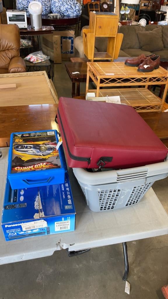 PANASONIC BLU RAY PLAYR WITH LAUNDRY BASKETS, STADIUM SEAT AND DOOR COAT HOOKS