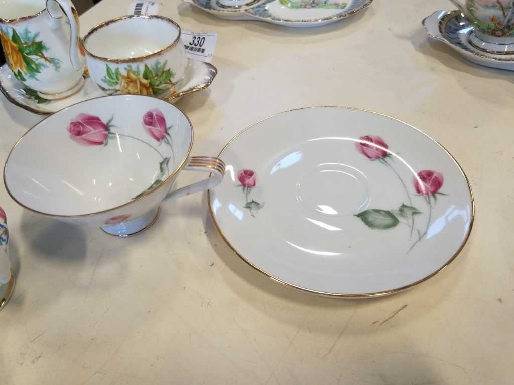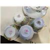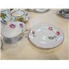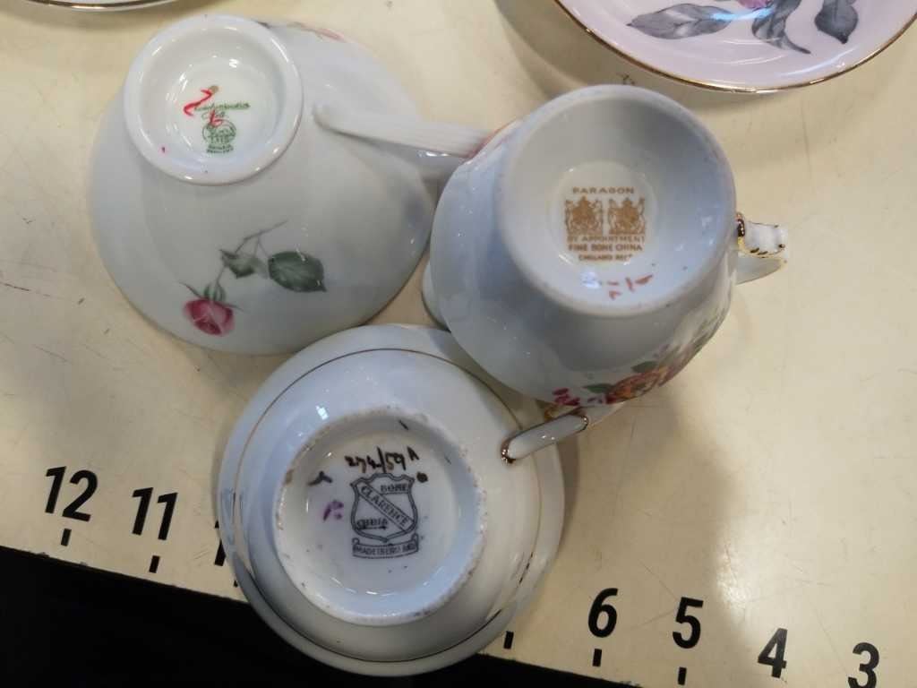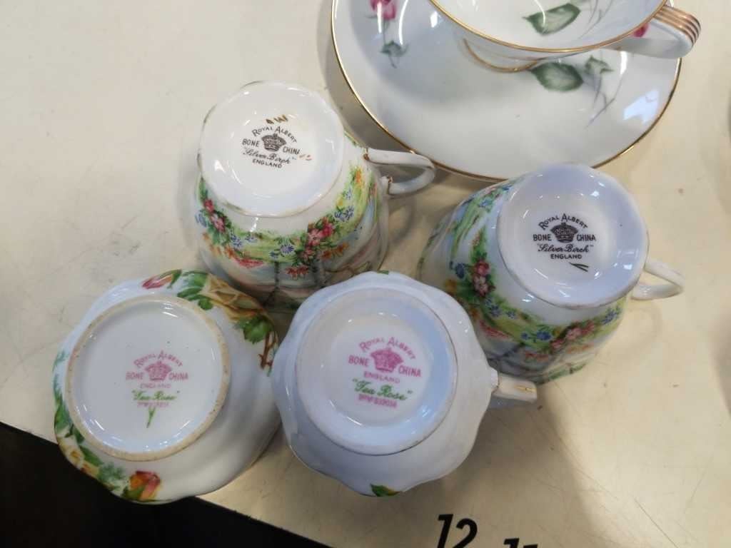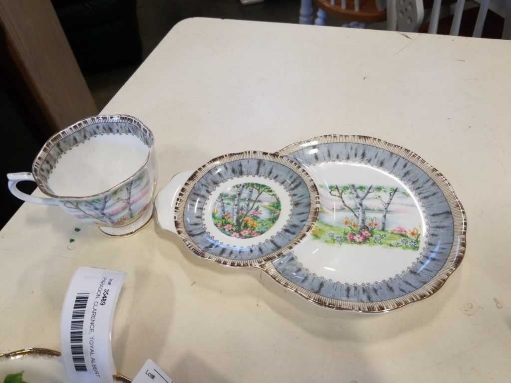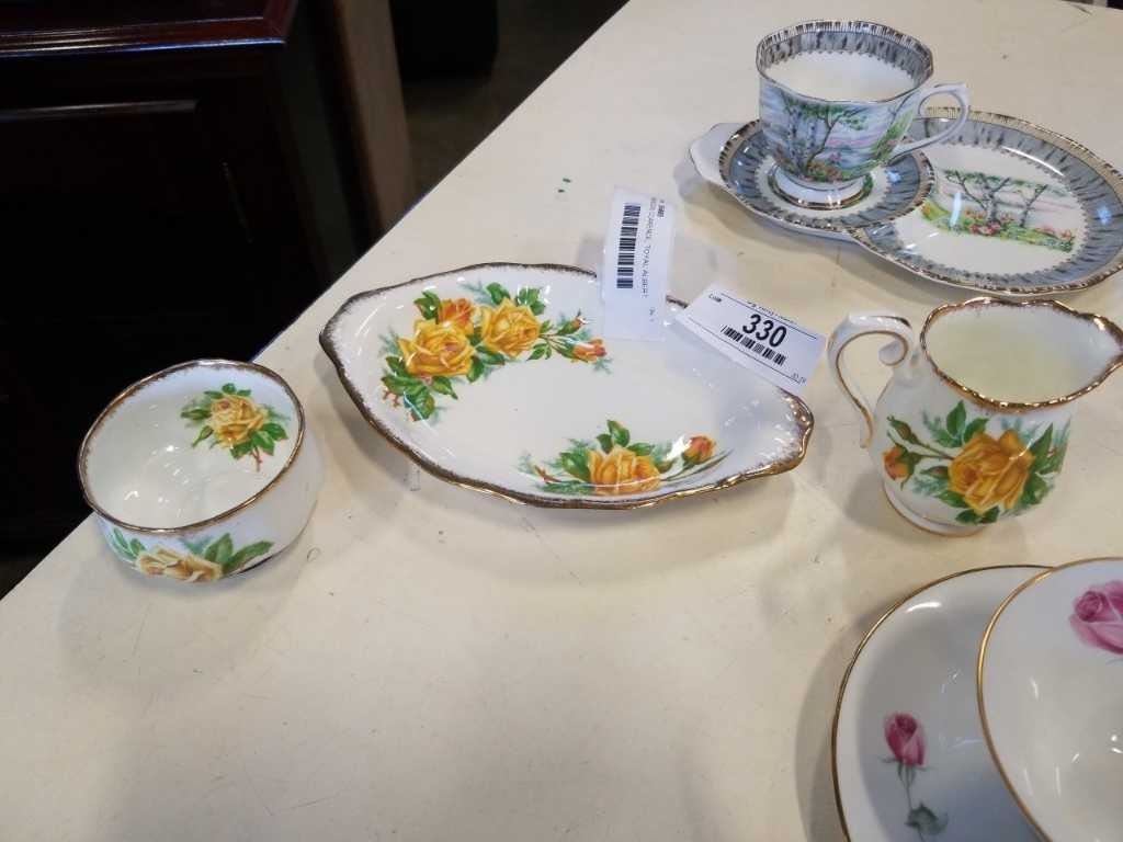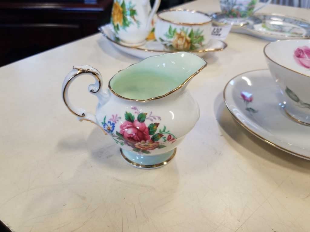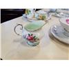 PARAGON, CLARENCE, ROYAL ALBERT CUPS AND SAUCERS AND CREAM AND SUGAR ON TRAY