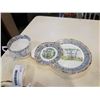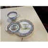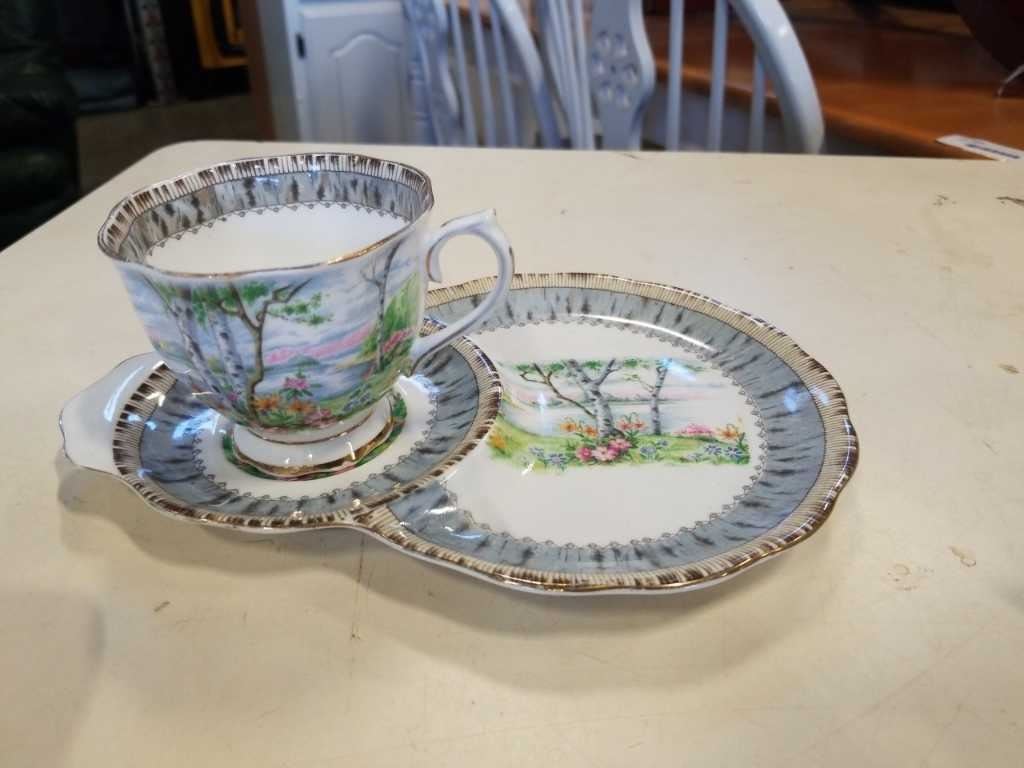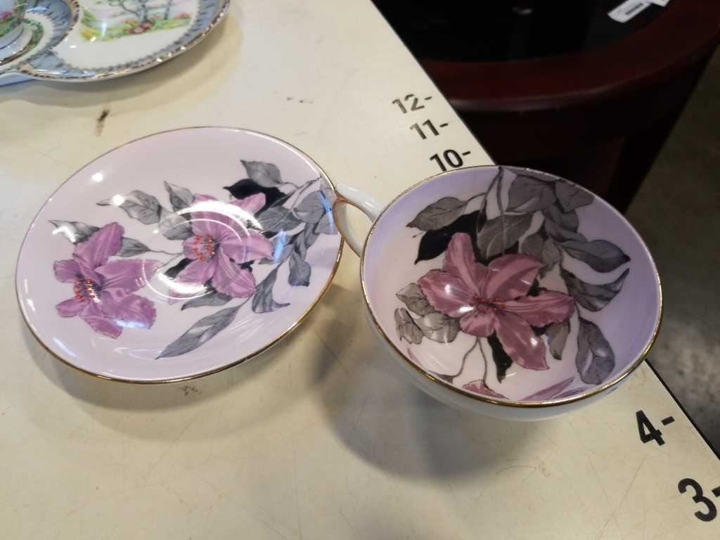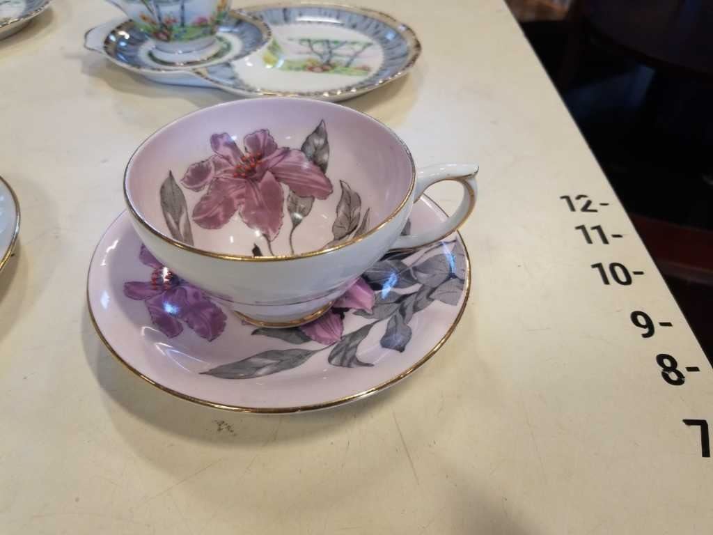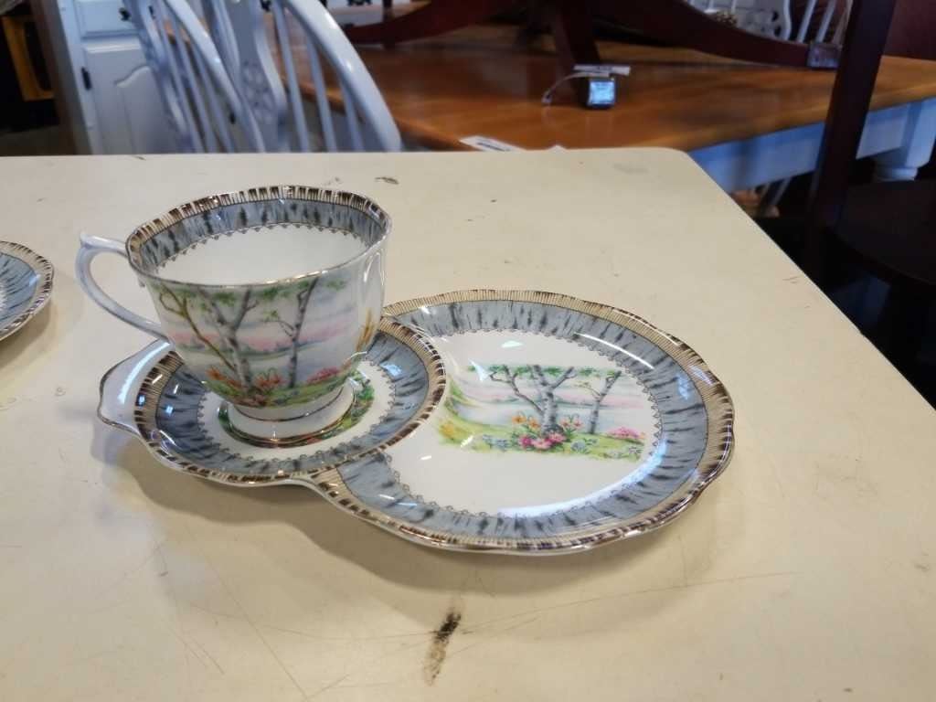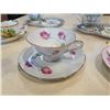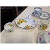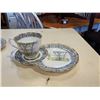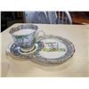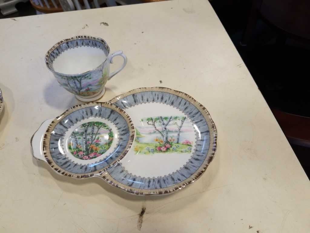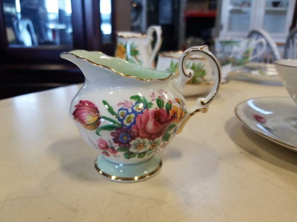 PARAGON, CLARENCE, ROYAL ALBERT CUPS AND SAUCERS AND CREAM AND SUGAR ON TRAY