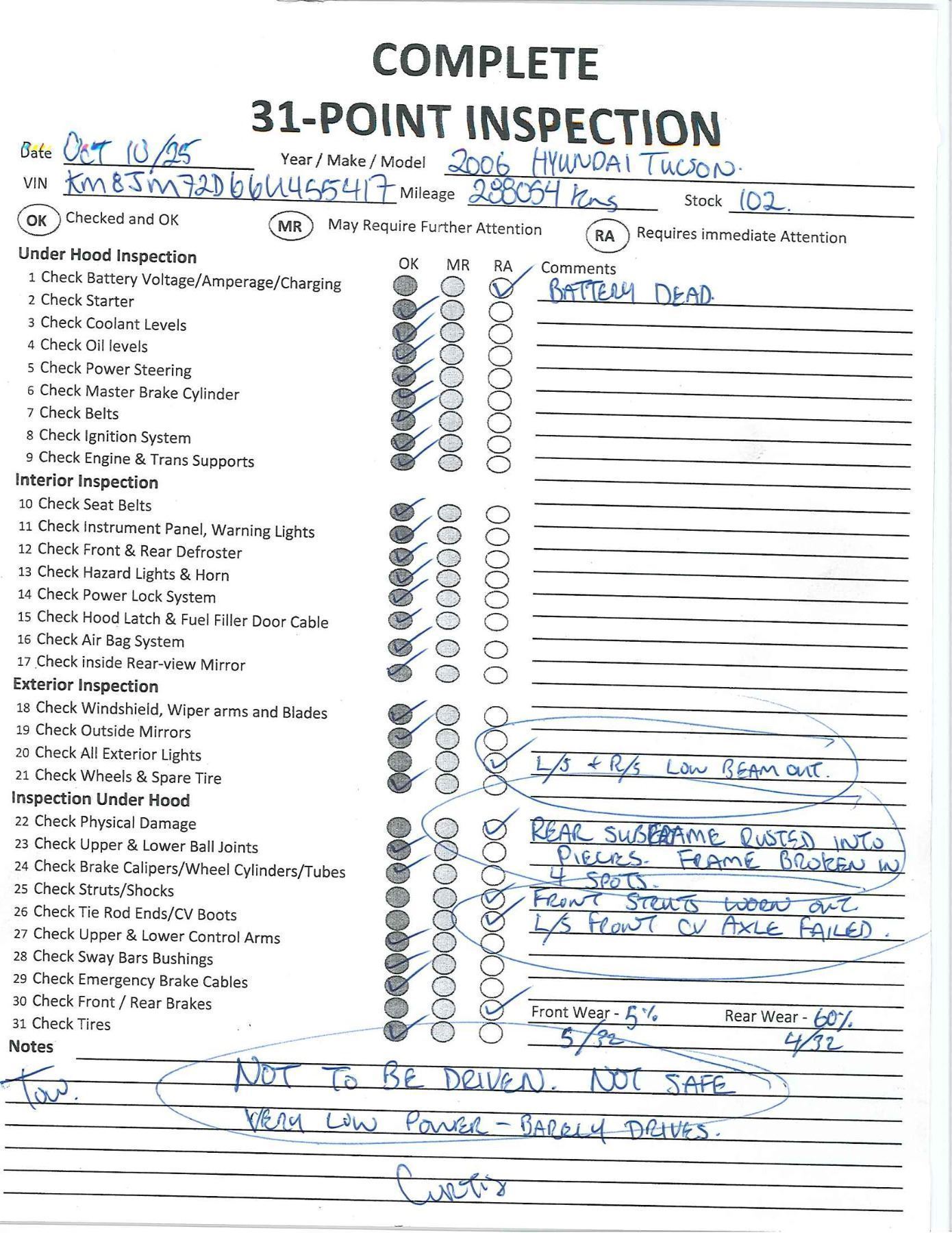 2006 HYUNDAI TUCSON, BLUE, 288053 KMS, 2.7L, 6 CYLINDER, GASOLINE, AUTOMATIC WITH TIPTRONIC, TRANSMISSION, ALL WHEEL DRIVE, 5 PASSENGER. AIR CONDITIONING, POWER WINDOWS, POWER LOCKS, TILT STEERING, CRUISE CONTROL, ALLOY WHEELS, ANTI THEFT, DUAL AIR BAGS, CD PLAYER, TRACTION CONTROL, FOG LIGHTS, ROOF RACK, POWER MIRRORS, NO REPORTED ACCIDENTS., CHIP OR CRACK IN WINDSHIELD, SPLIT-FOLDING REAR SEATS. DECLARATIONS: EX-OUT OF PROVINCE 0 ACCIDENTS 0 GLASS CLAIM, TOTALLING $0. SERVICE HISTORY SHOWS3 RECORDS. AUCTION NOTES: TMU DUE TO CARFAX DISCREPANCIES STOCK #: P455417 KM8JM72D66U455417 NOT SUITABLE FOR TRANSPORTATION, MUST TOW.