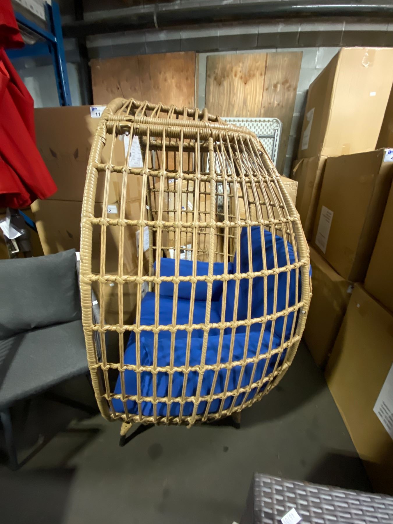 PATIO BLISS BEIGE WICKER OUTDOOR PATIO EGG CHAIR WITH BLUE CUSHION *IN BOX*