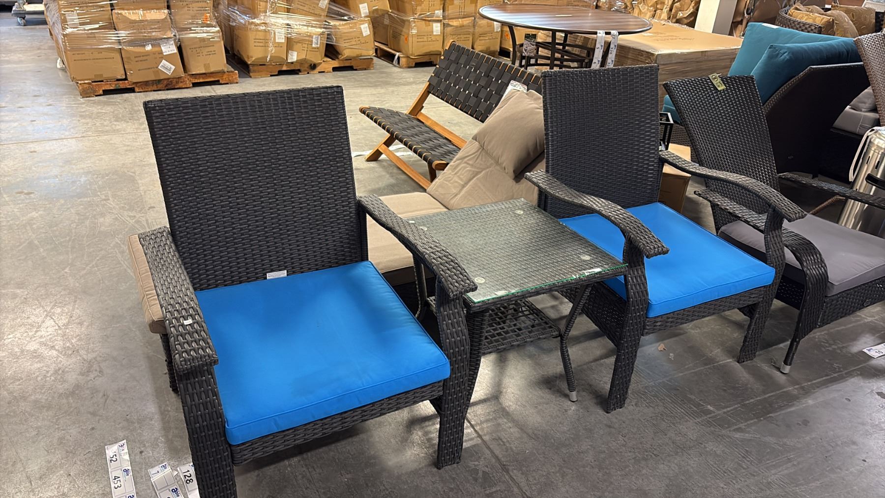 PATIO FLARE WHYLIE 3 PIECE CHAT SET WITH BLUE CUSHIONS