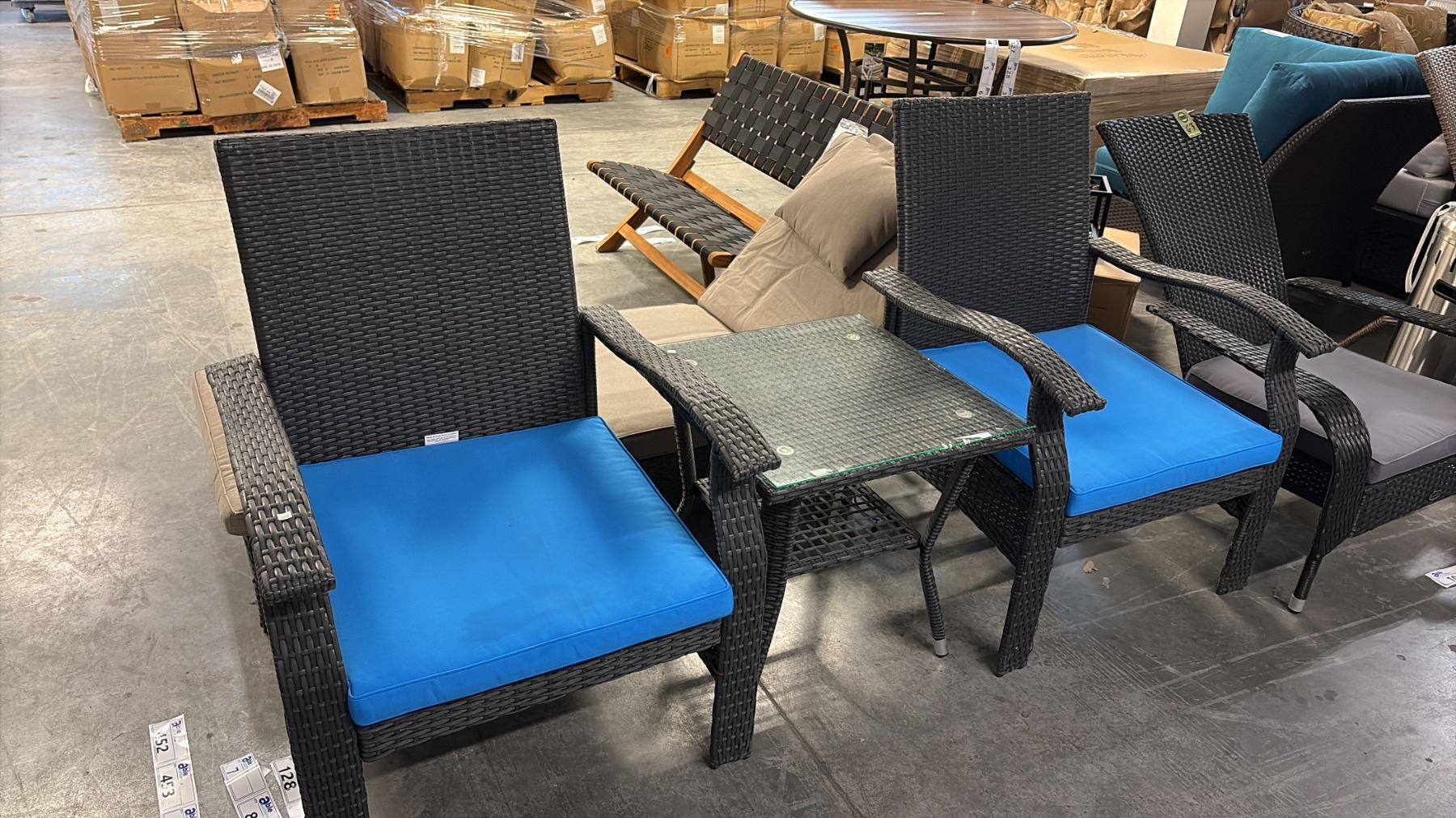 PATIO FLARE WHYLIE 3 PIECE CHAT SET WITH BLUE CUSHIONS