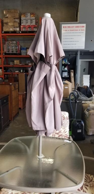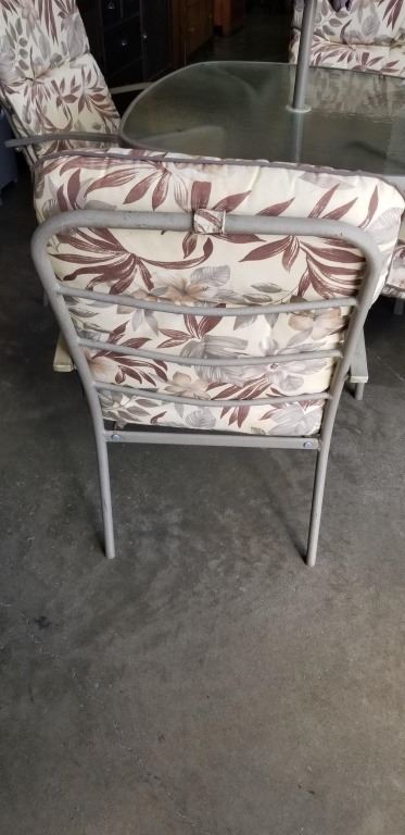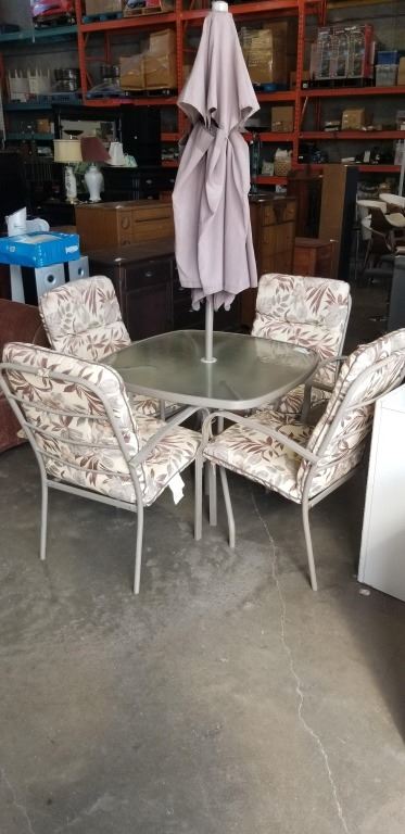 PATIO SET WITH GLASSTOP TABLE, UNBRELLA AND FOUR CHAIRS