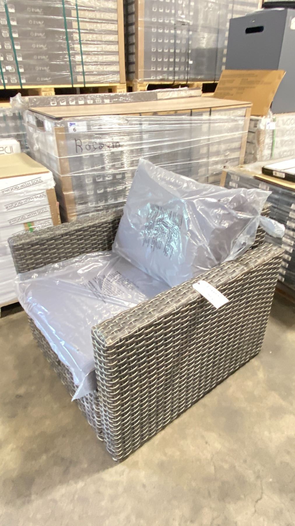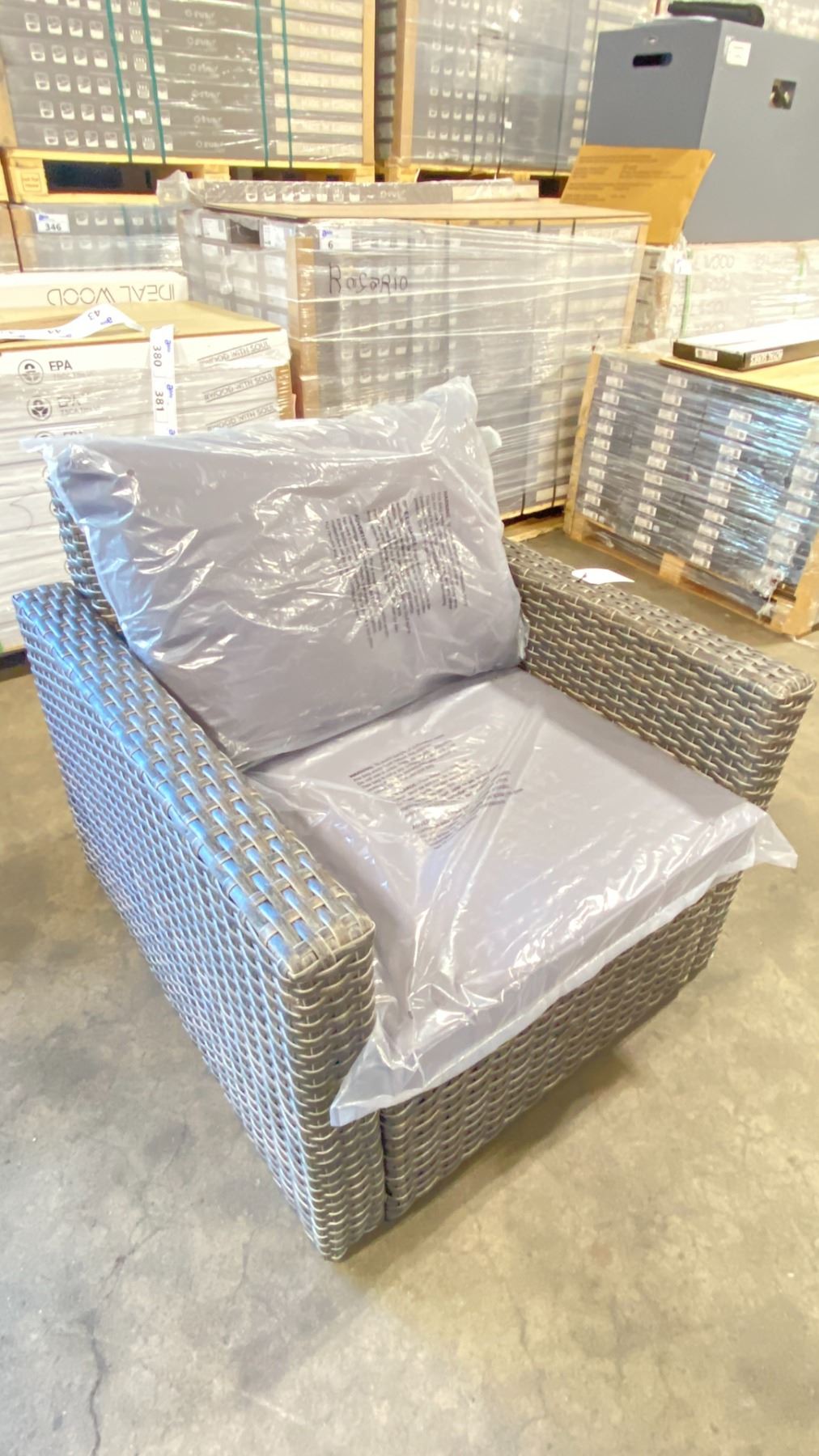 PATIOFLARE WHITNEY PF10017 GREY PLASTIC RATTAN OUTDOOR PATIO ARM CHAIR WITH GREY CUSHIONS *IN BOX*