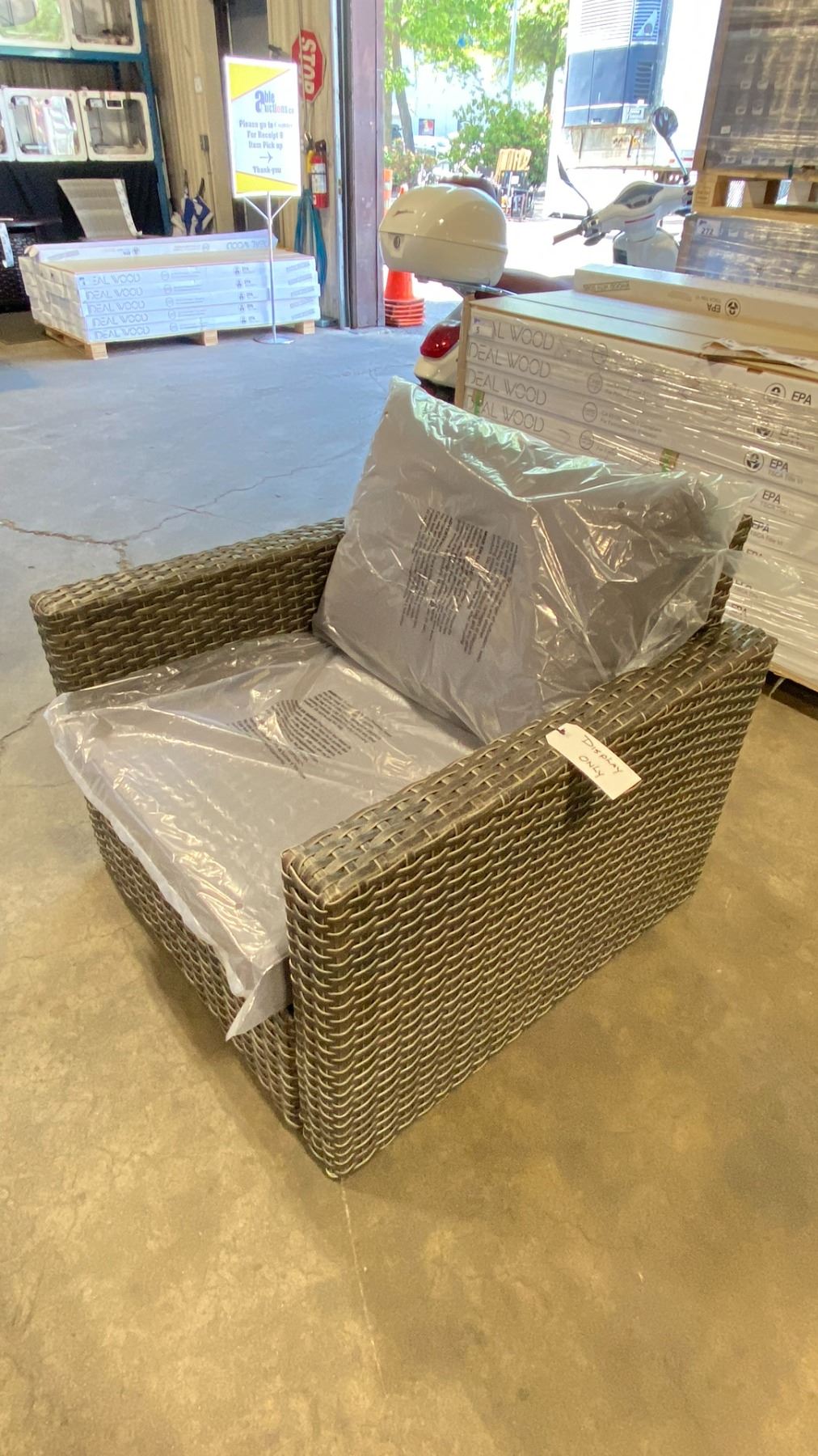 PATIOFLARE WHITNEY PF10017 GREY PLASTIC RATTAN OUTDOOR PATIO ARM CHAIR WITH GREY CUSHIONS *IN BOX*