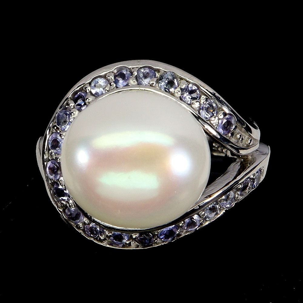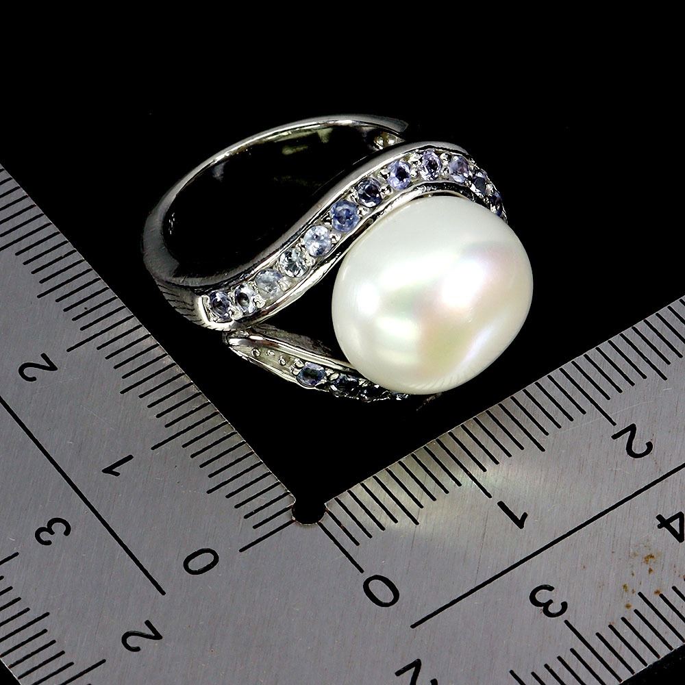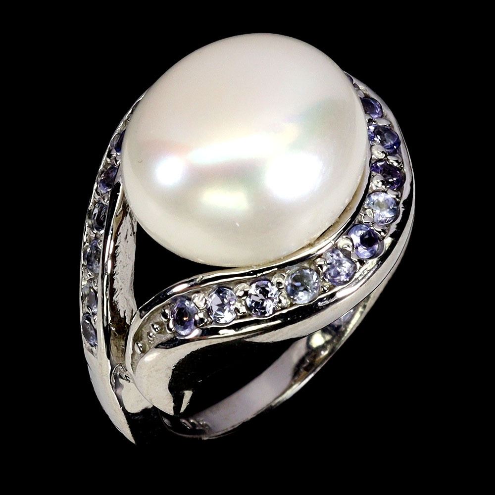 PEARL AND TANZANIRE RING IN 14K WHITE PLATED GOLD OVER 925 STERLING SILVER - SIZE 7 -APPRAISED REPLACEMENT VALUE