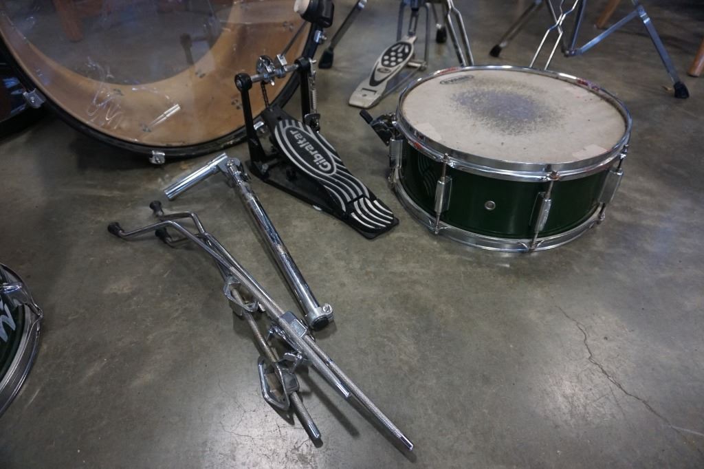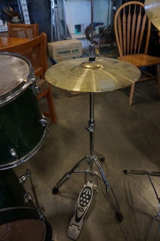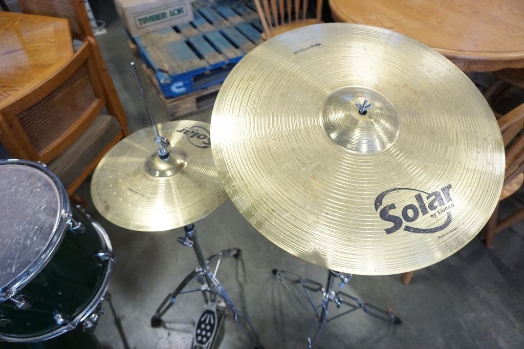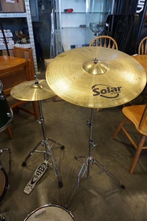 PEARL DRUM KIT, 3 TOMS, BASE DRUM, SNARE, HI-HAT WITH SOLAR SABIAN SYMBOL AND SOLAR SABIAN CYMBOL ON STAND