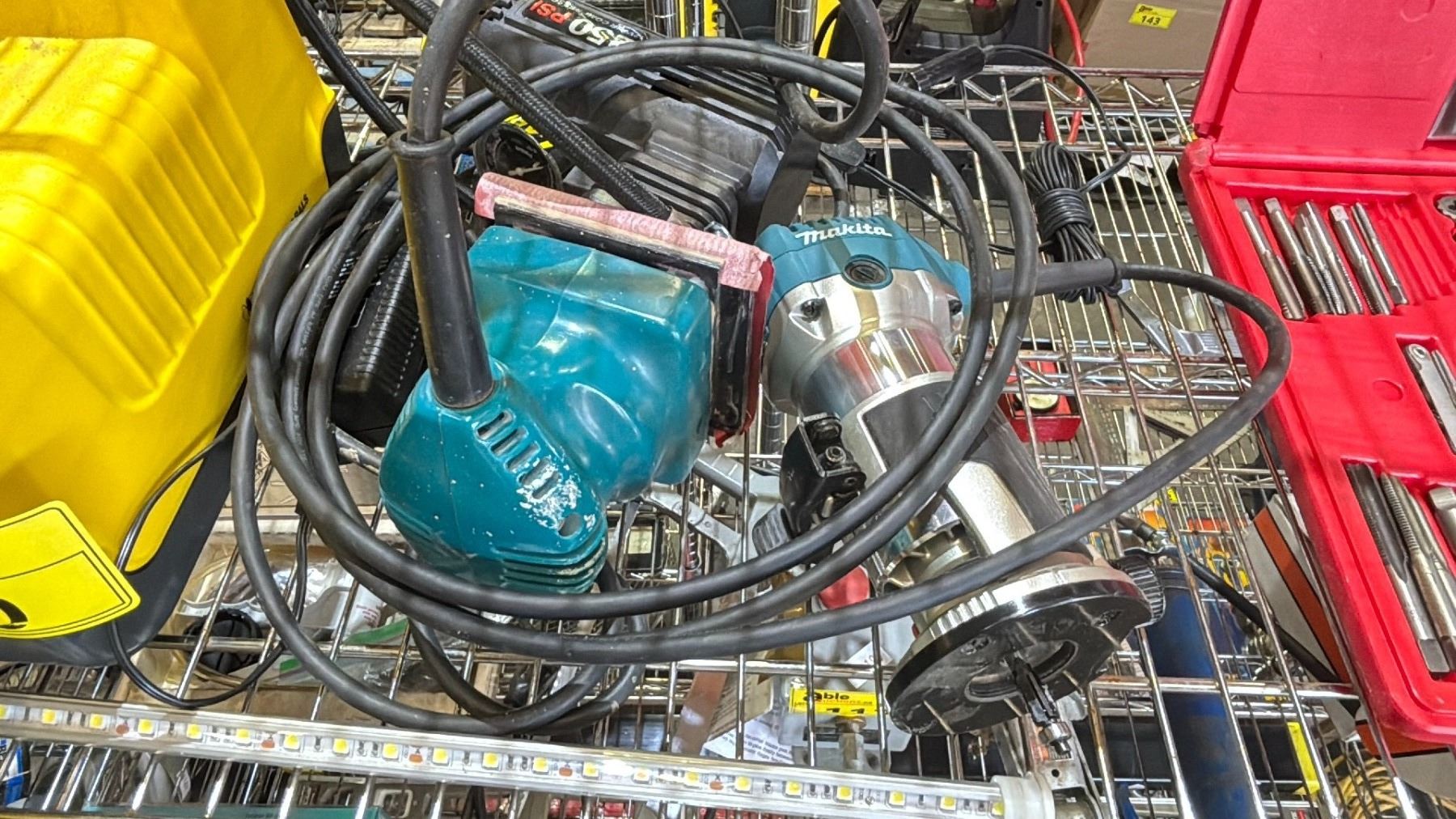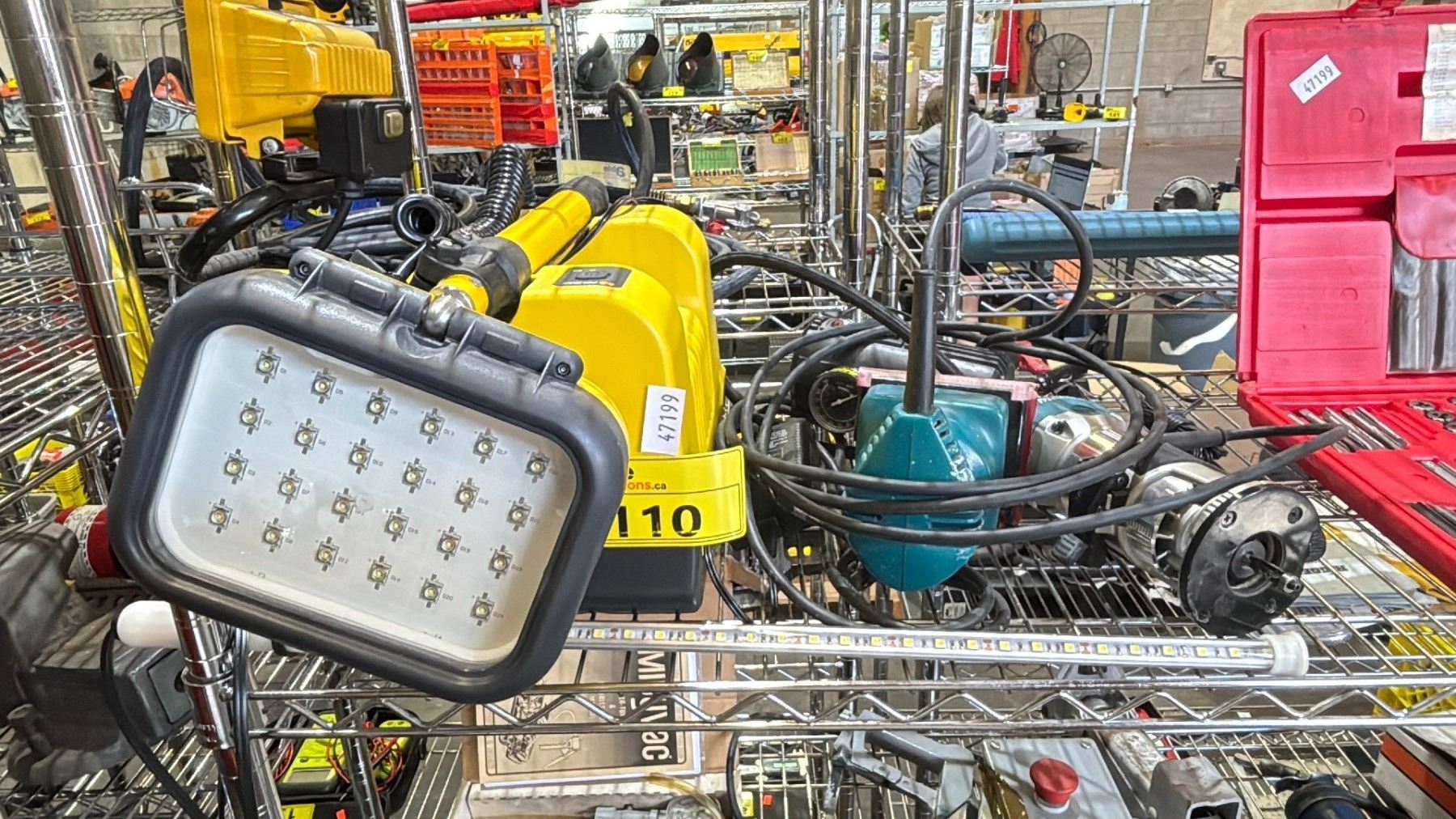 PELICAN REMOTE AREA LIGHTING SYSTEM, ASSORTED SHOP LIGHTS, 250 PSI HAND AIR COMPRESSOR & ELECTRIC HAND TOOLS