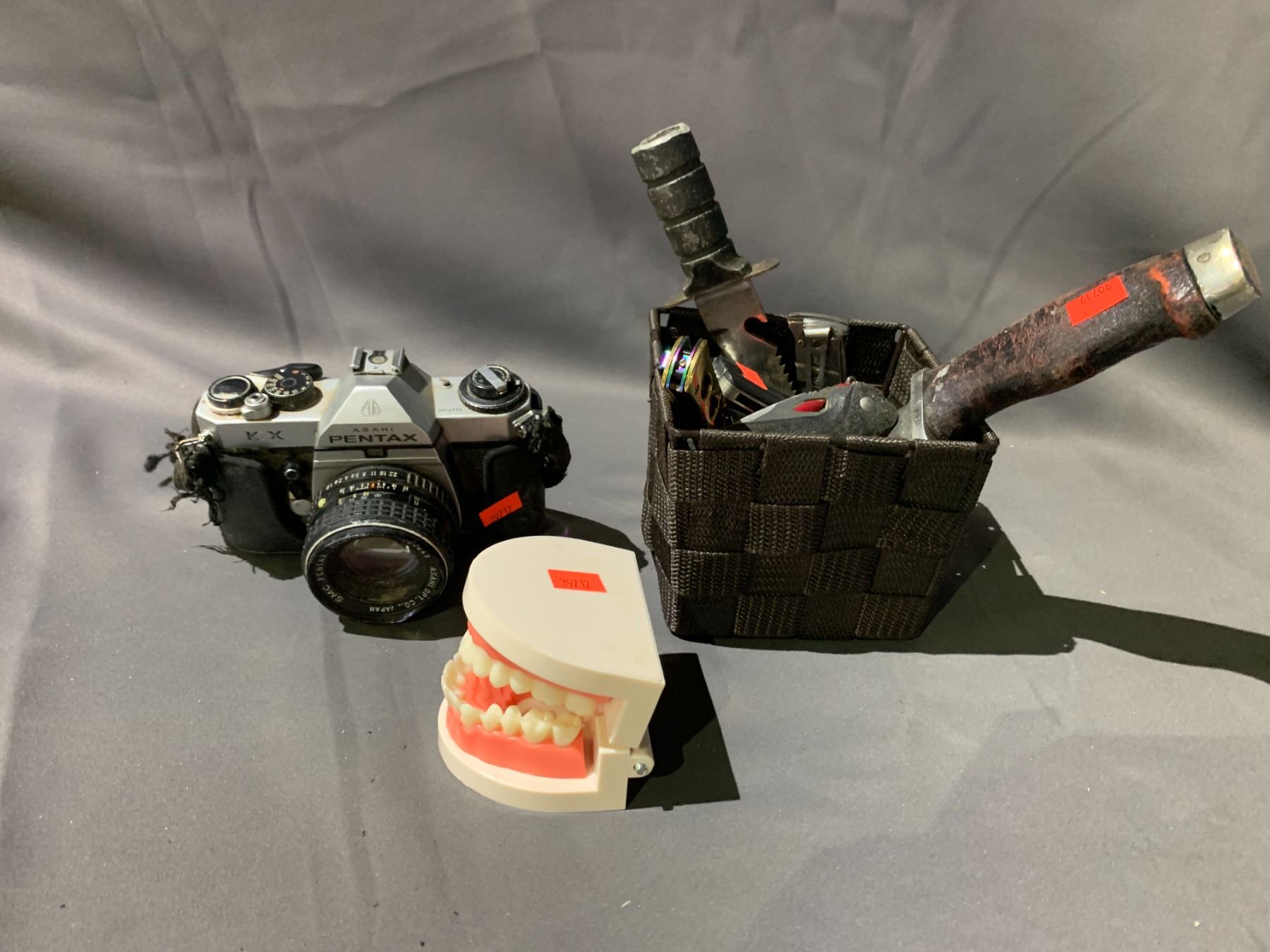 PENTAX CAMERA, BIN OF ASSORTED KNIVES AND MORE