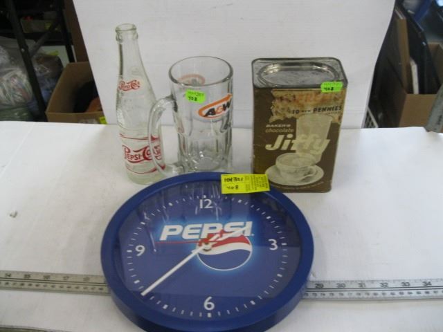 PEPSI CLOCK & BOTTLE, A&W MUG & A JIFFY TIN