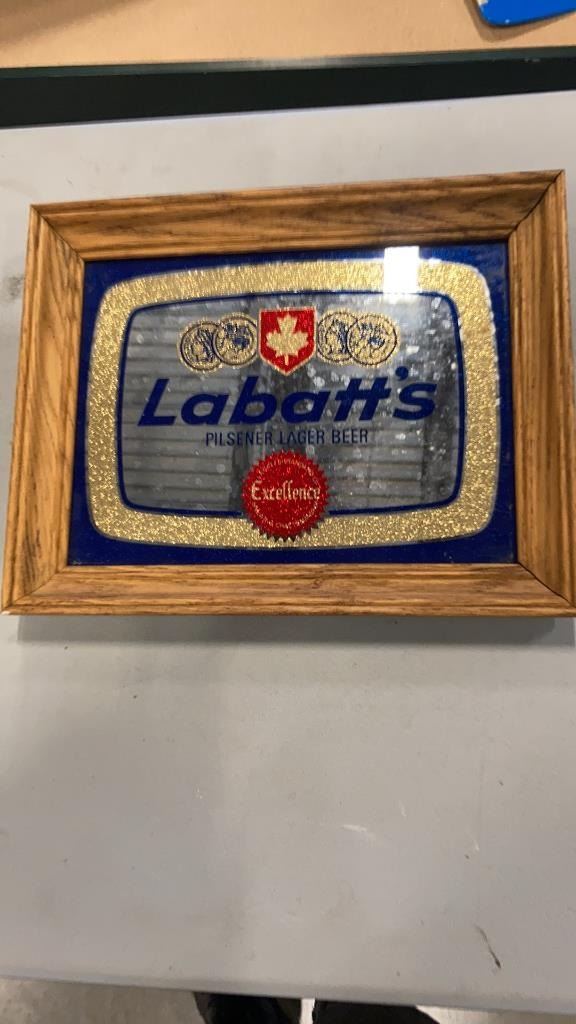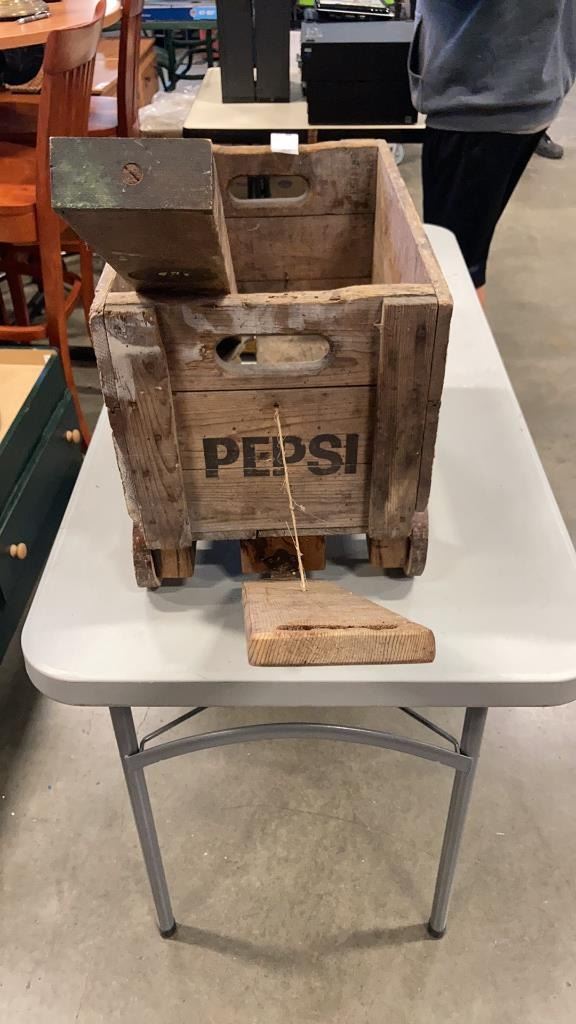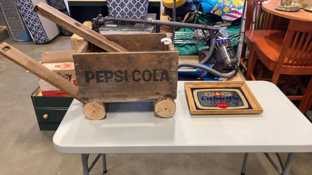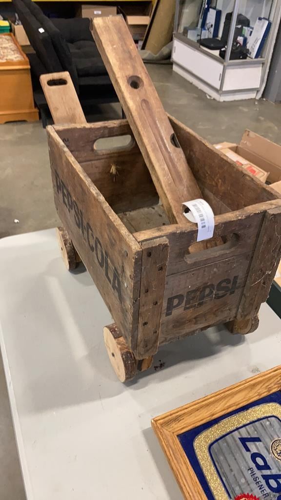 PEPSI CRATE FOLK ART WAGON, LABATTS MIRRORED BEER ADVERT AND VINTAGE LEVEL