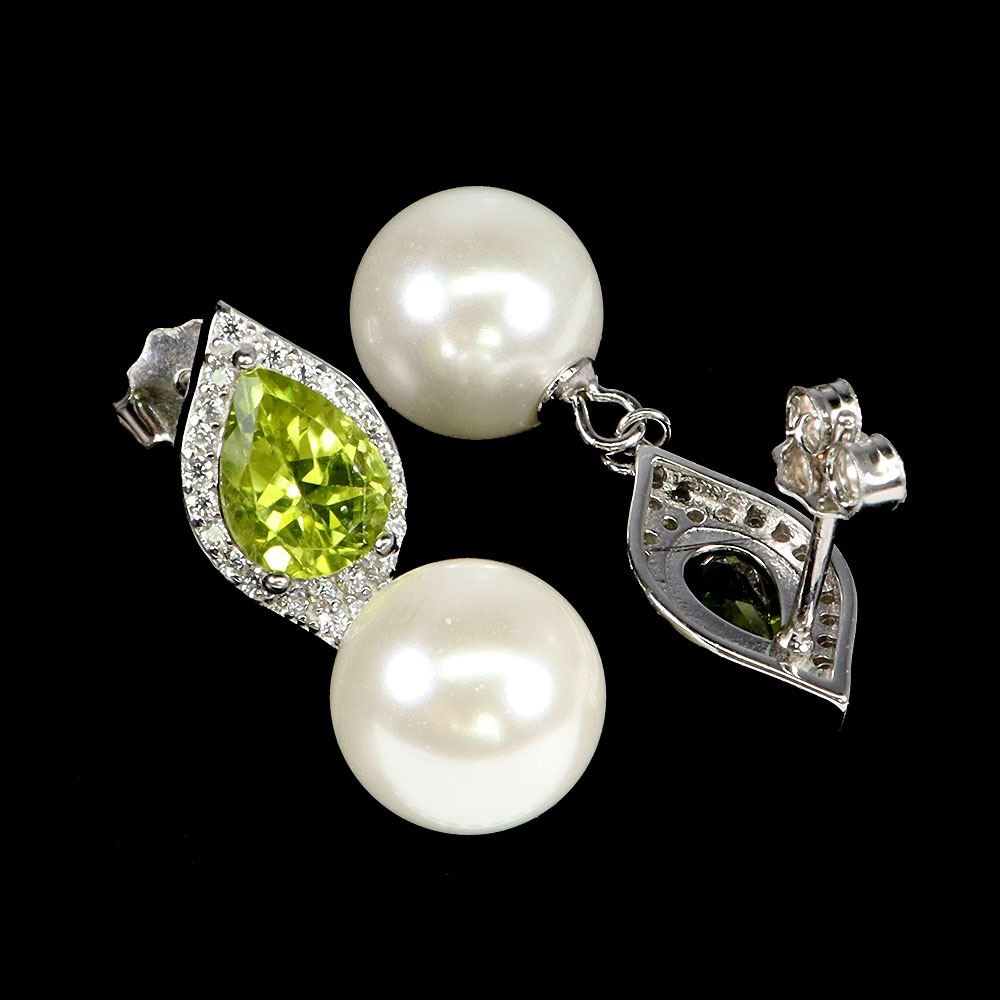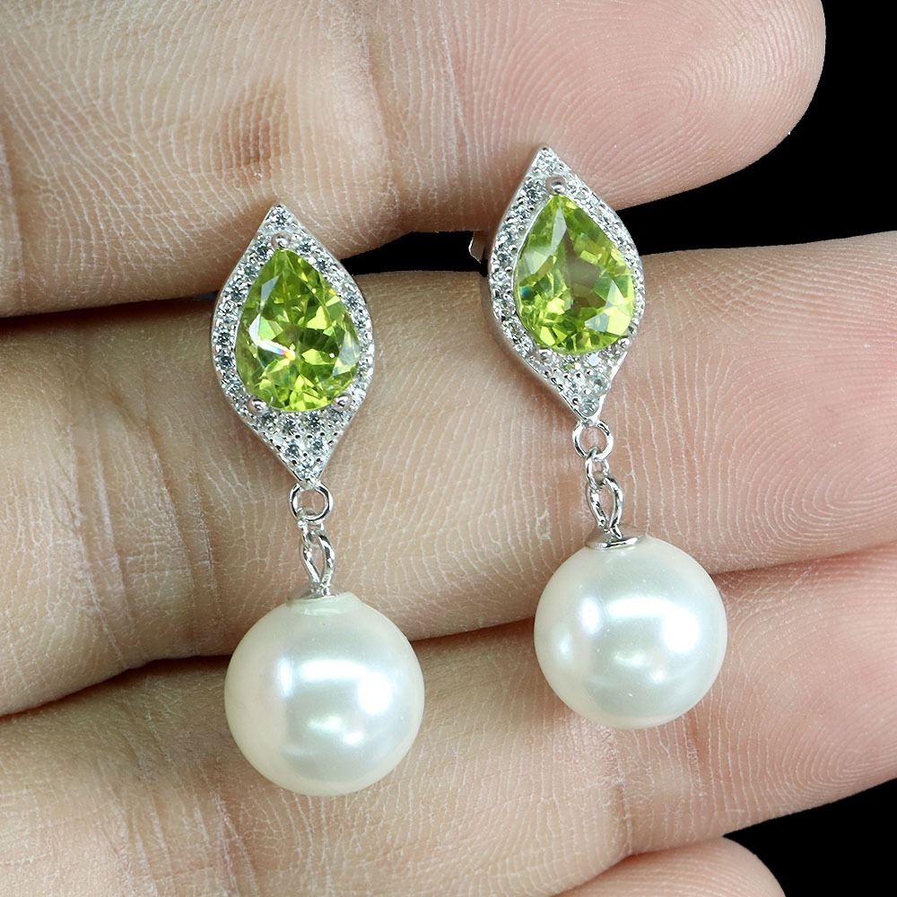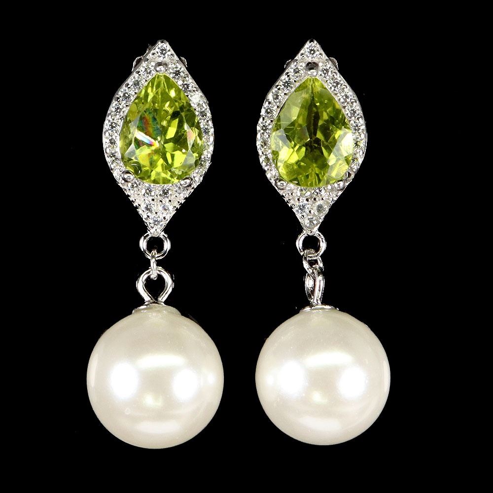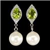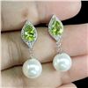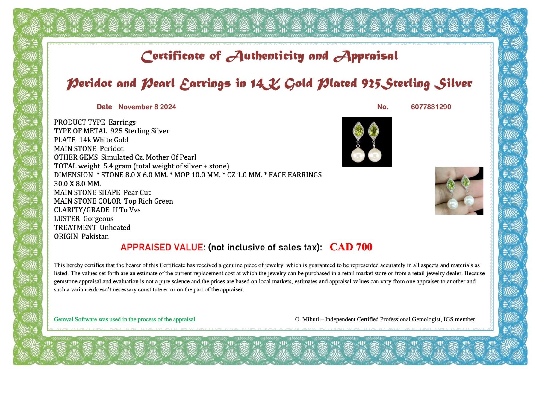 PERIDOT AND PEARL EARRINGS in 14K White Gold plated 925 Sterling Silver – Appraised Replacement Value CAD 700