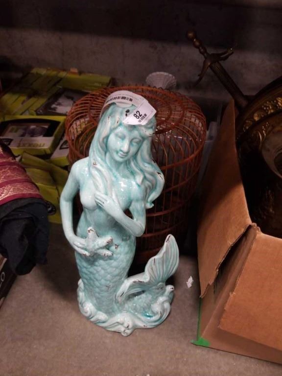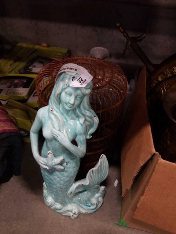 PIER 1 MERMAID FIGURE 22 INCHES TALL, WOOD BIRDCAGE, PUNCH BOWL AND CAKE PEDESTALS