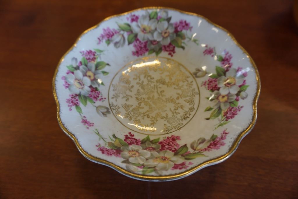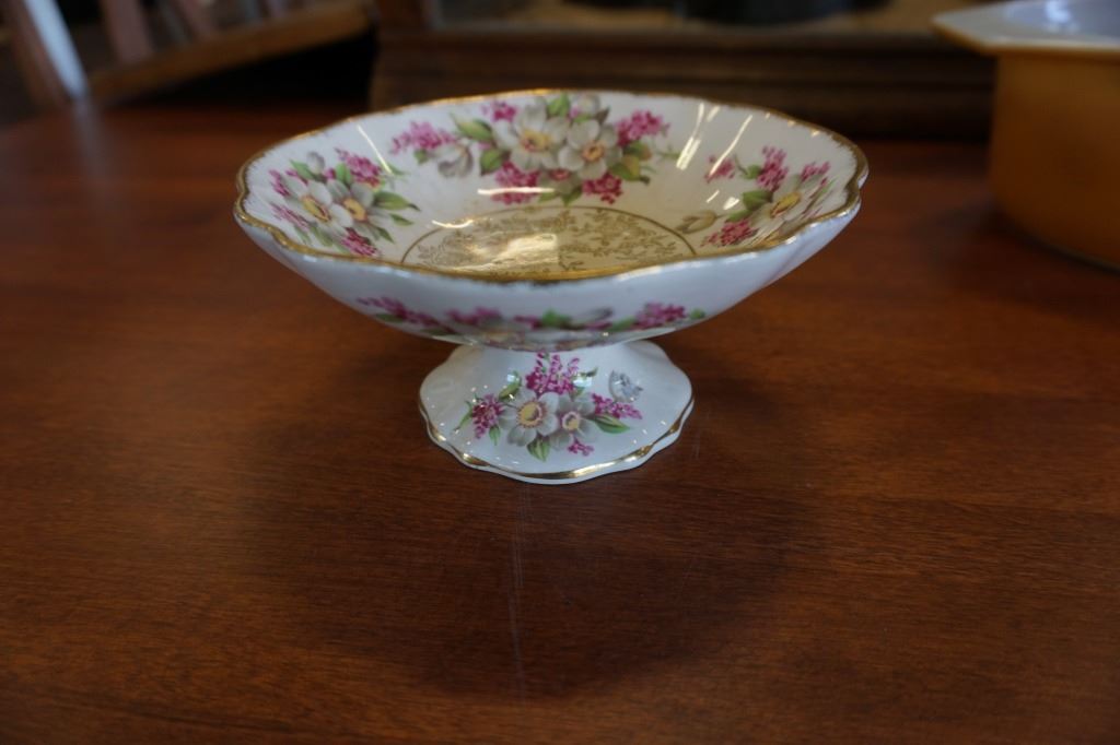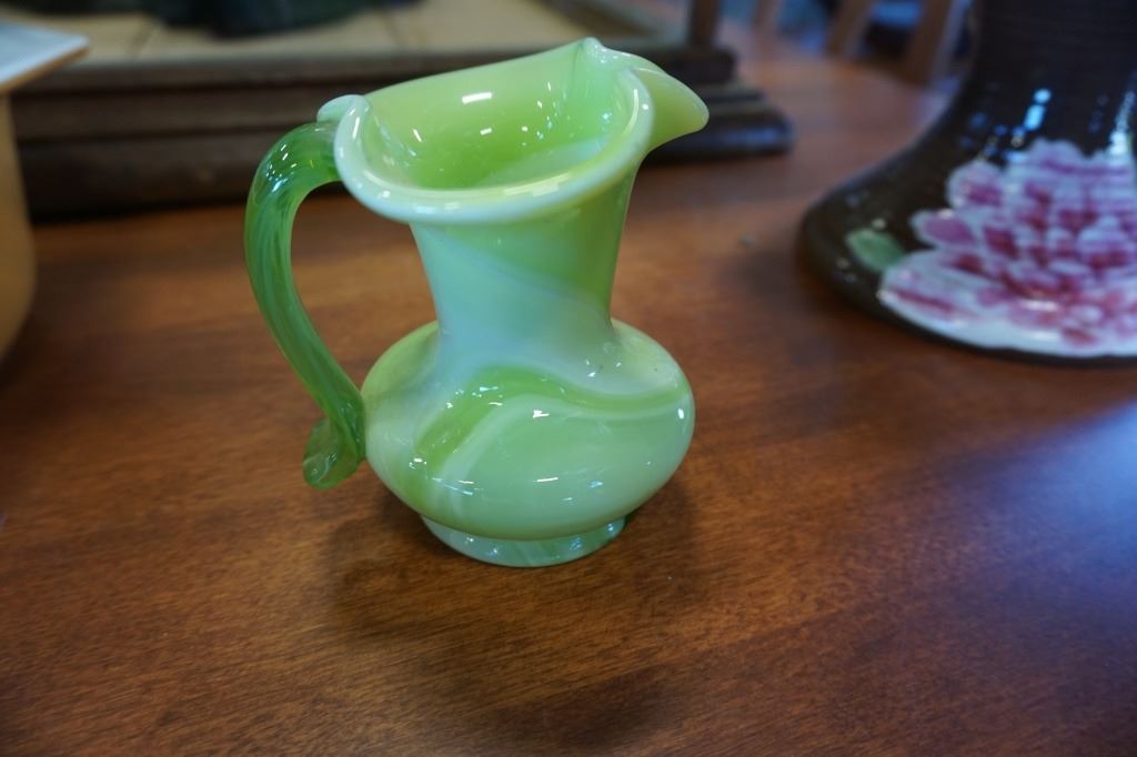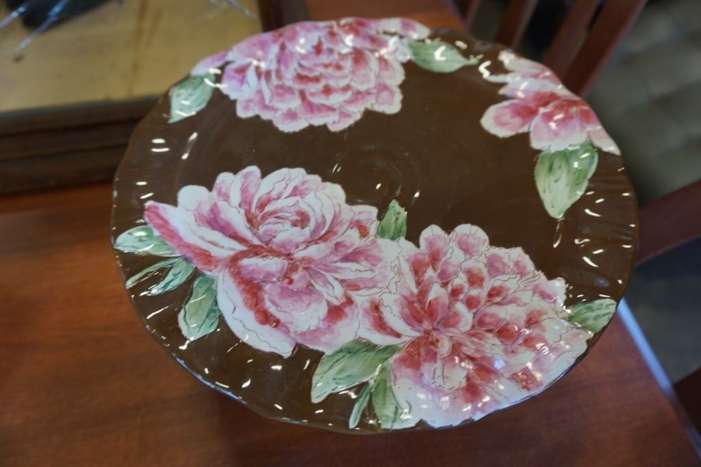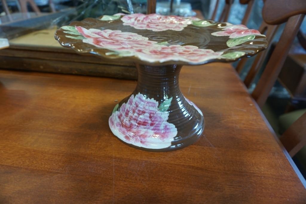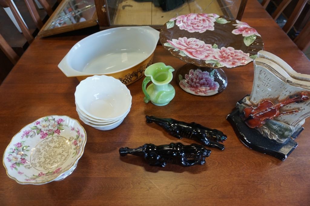 PINK PEONY CAKE PLATTER, PYREX DISH, ART GLASS PITCHER, JAPAN TIGER FIGURE