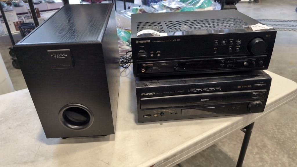 PIONEER AUDIO VIDEO RECEIVER MODEL VSX-305, PIONEER CD / LASER DISC PLAYER MODEL CLD- M403 AND PIONEER SUBWOOFER, MODEL HTP 100-SW