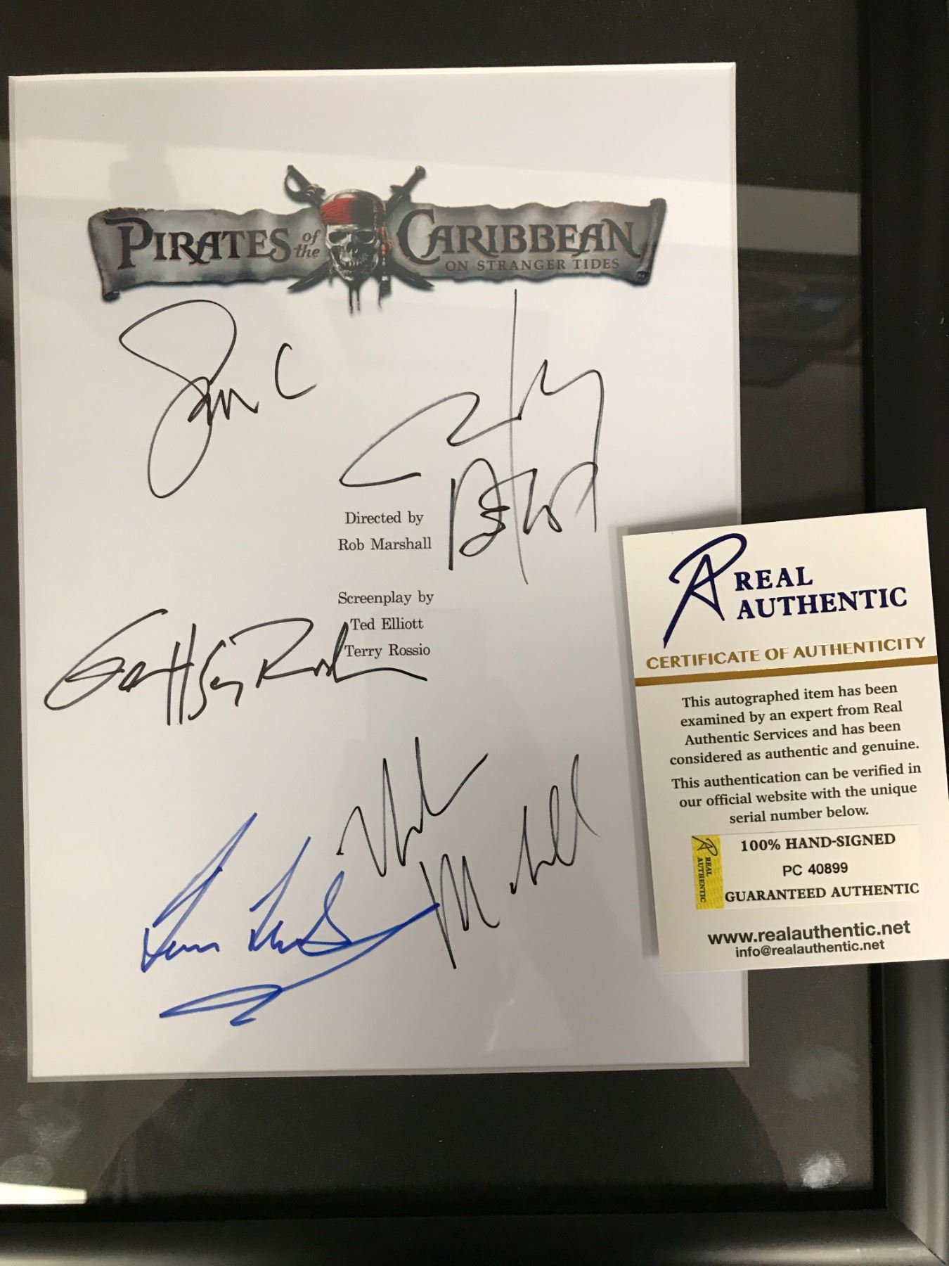 PIRATES OF THE CARIBBEAN CAST SIGNED AND FRAMED SCRIPT COVER (RA COA)