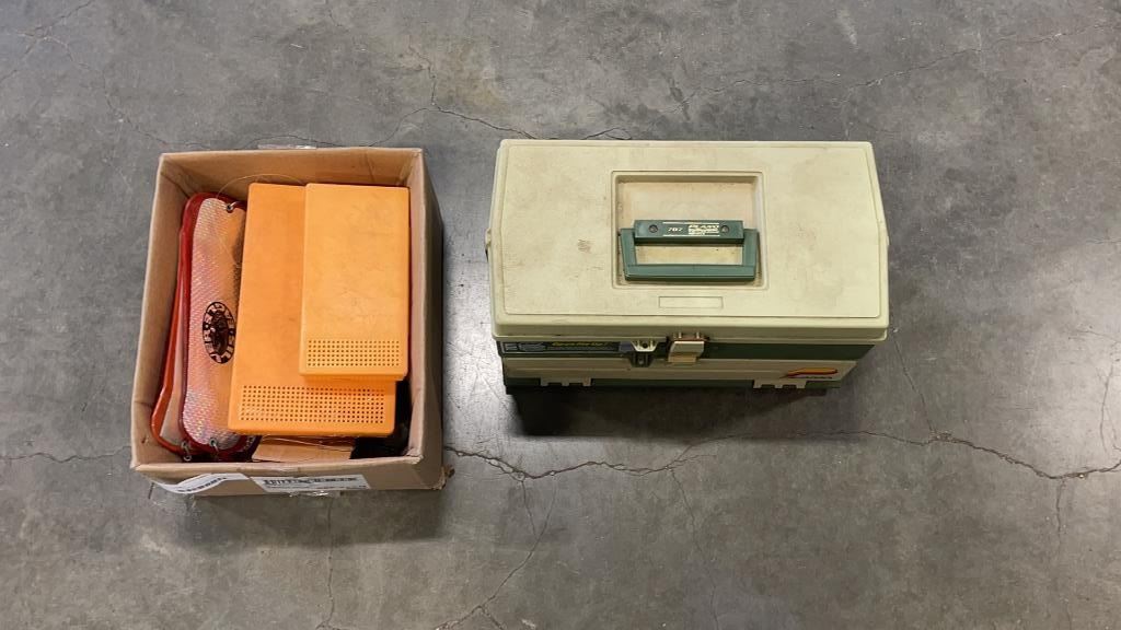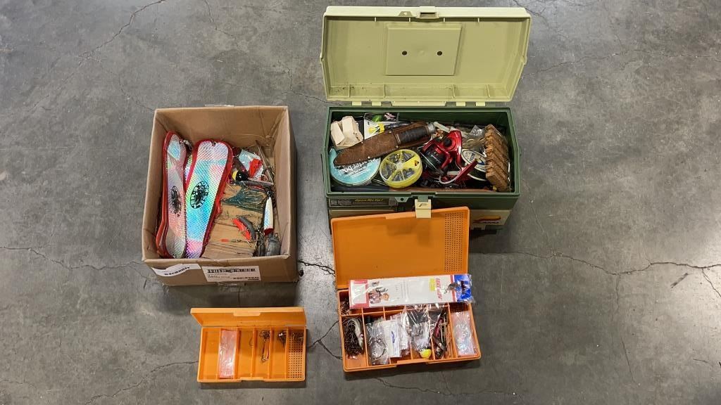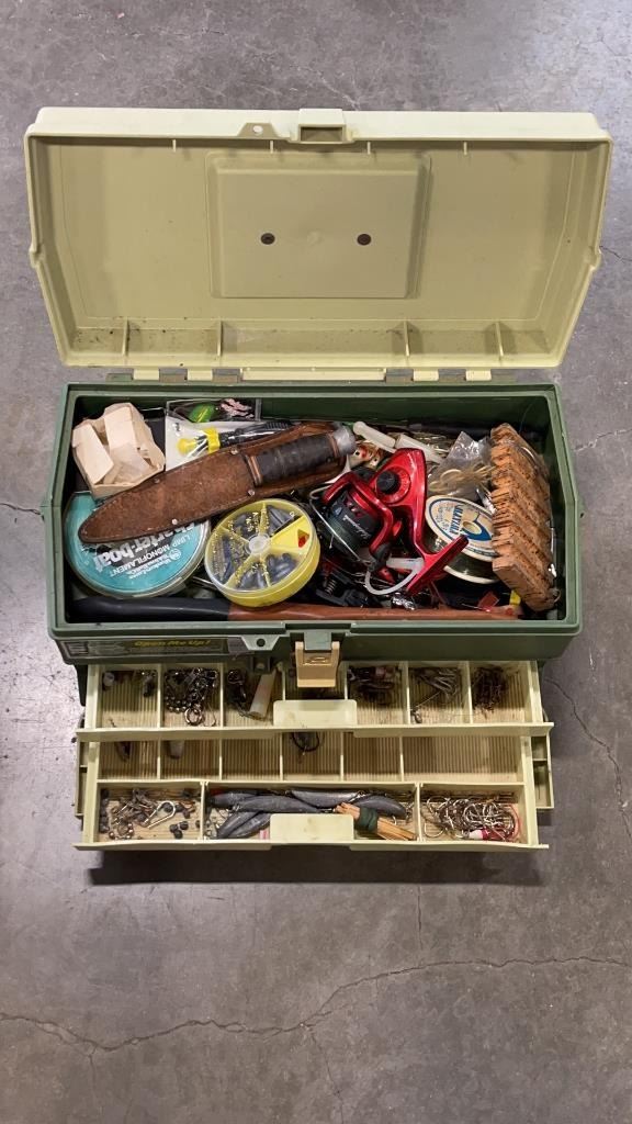 PLANO TACKLEBOX FULL OF FISHING GEAR, AND TACKLE, WEIGHTS, HOOKS, SHAKESPEAR REEL AND KNIFE, AND BOX