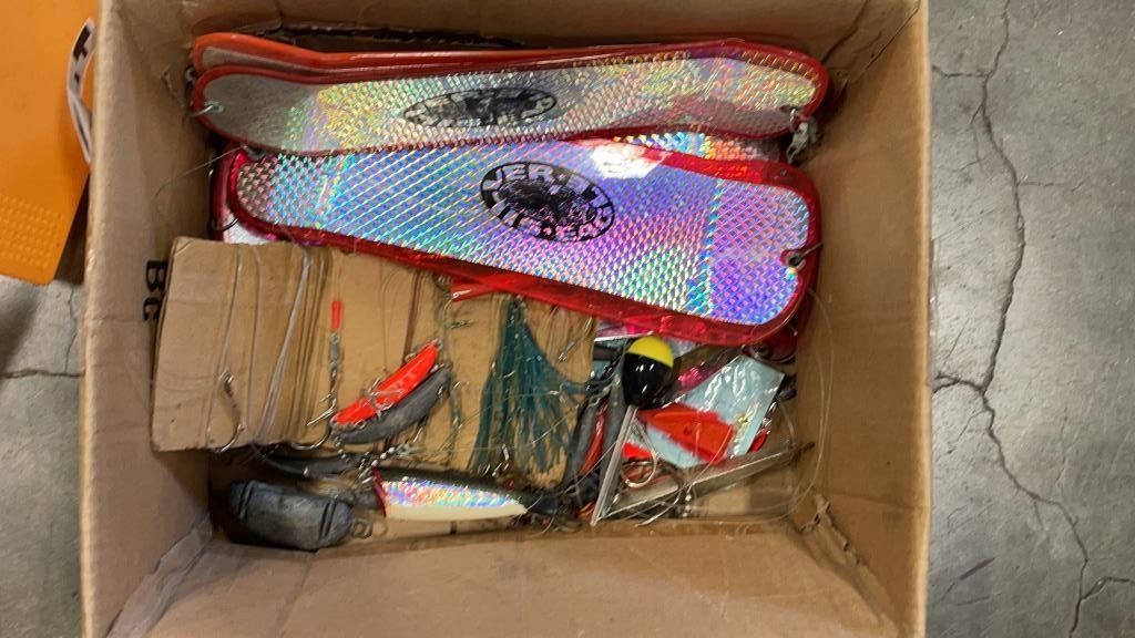 PLANO TACKLEBOX FULL OF FISHING GEAR, AND TACKLE, WEIGHTS, HOOKS, SHAKESPEAR REEL AND KNIFE, AND BOX OF FLASHERS AND OCEAN LURES