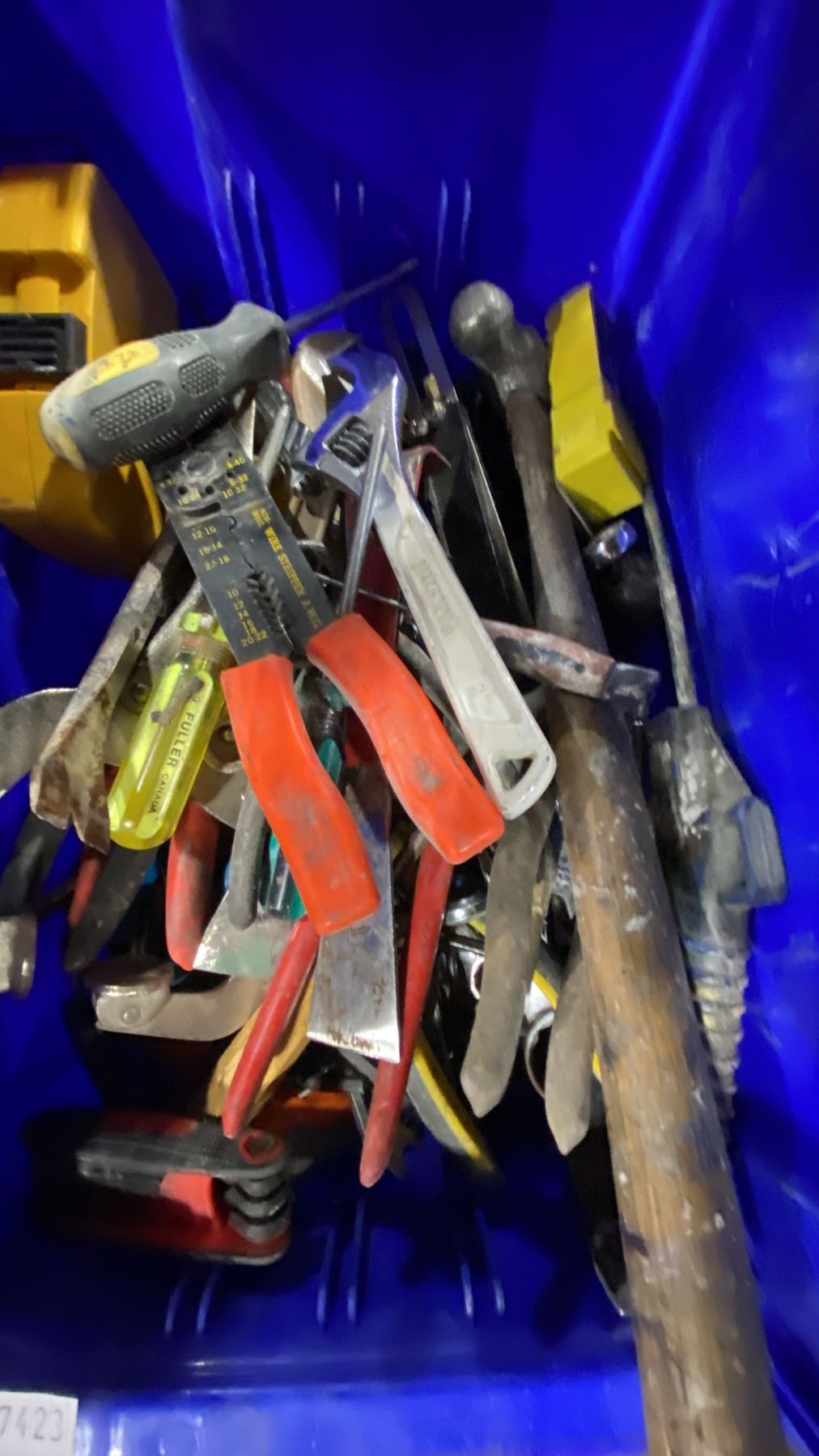 PLASTIC BIN OF ASSORTED HAND TOOLS *BIN INCLUDED*