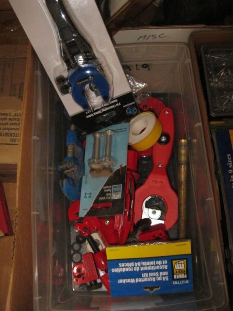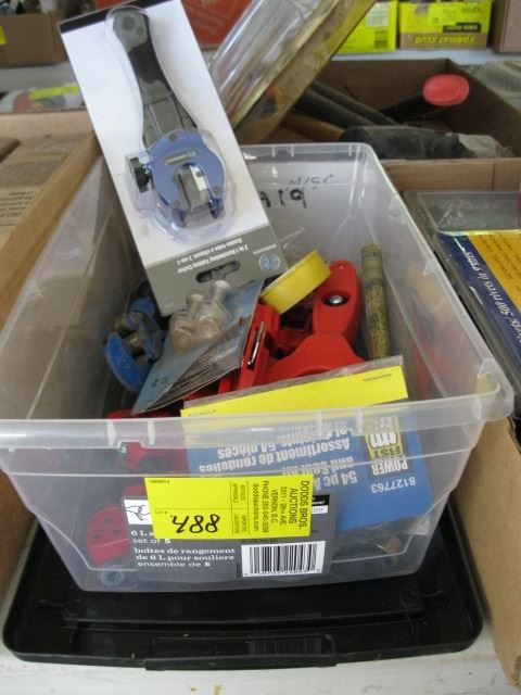 PLASTIC BIN OF MISC. - TUBING CUTTERS, ETC.