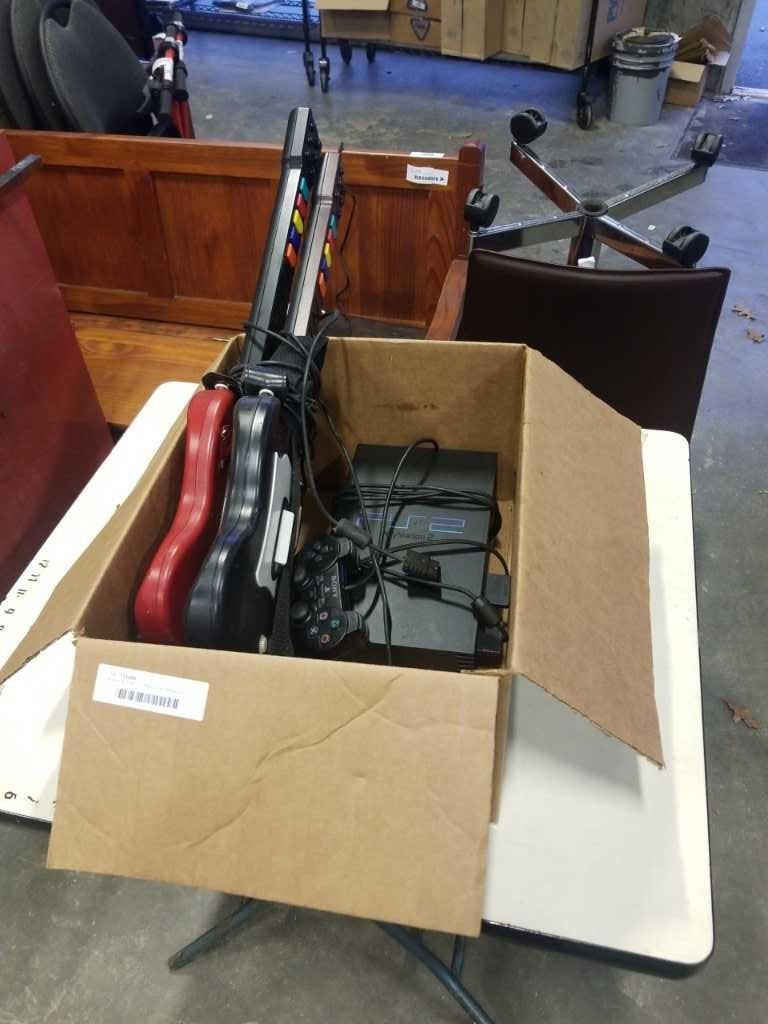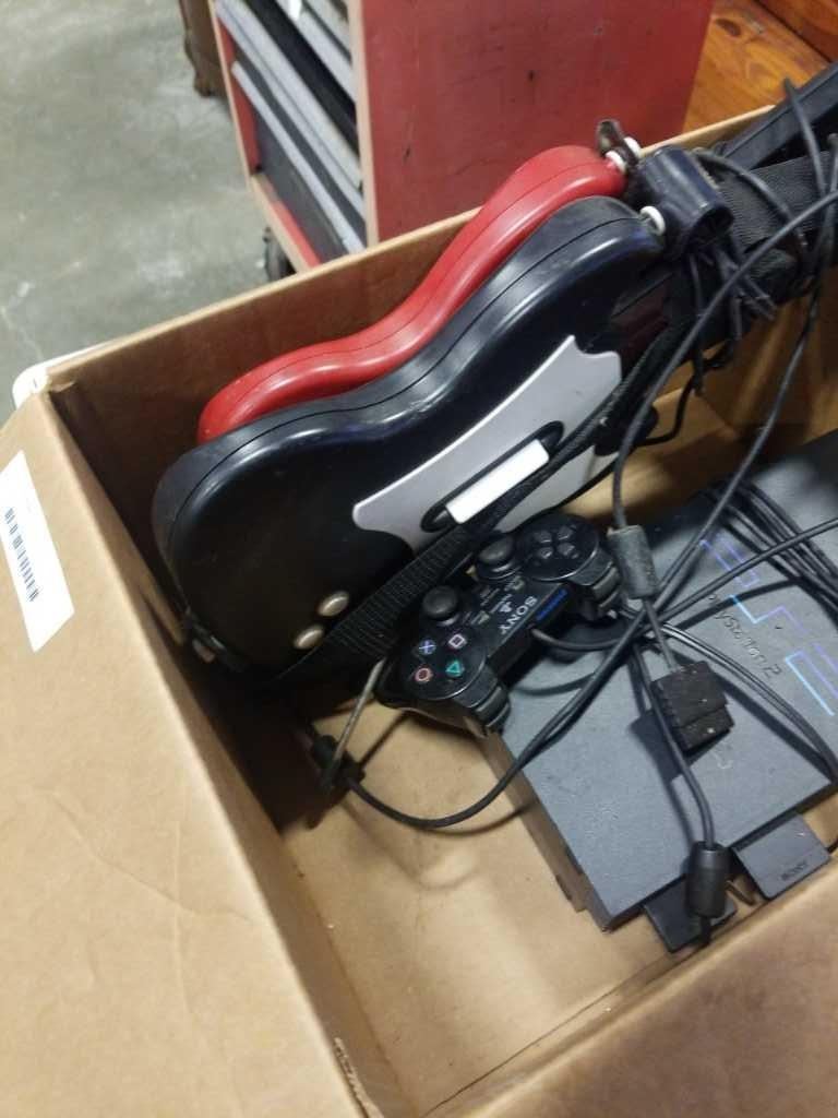 PLAYSTATION 2 CONSOLE WORKING WITH CONTROLLER, MEMORY CARD AND 2 GUITAR CONTROLLERS